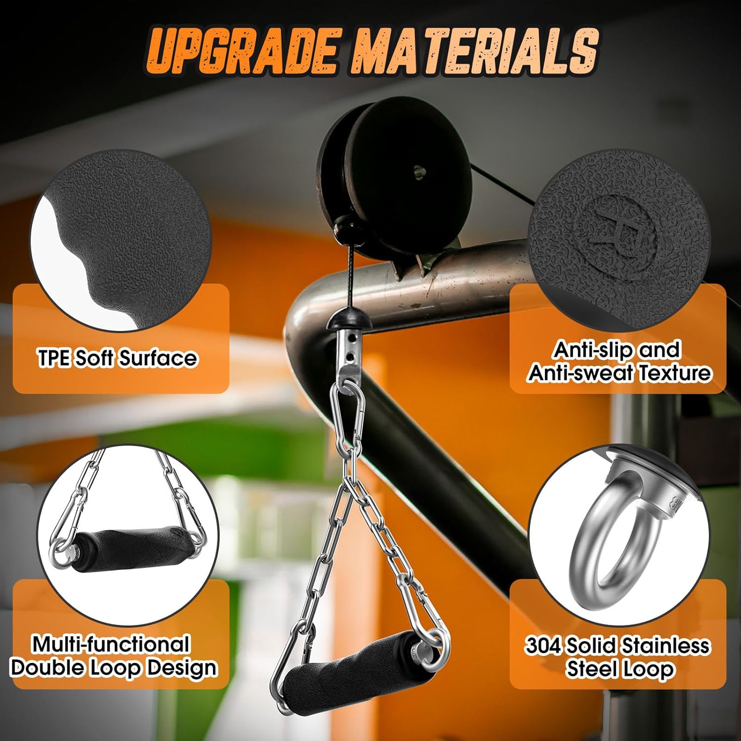 Designed for DIY: The exercise cable handle accessory is equipped with 2 x 304 stainless steel extension chains and 4 x carabiner hooks, allowing you to combine and match them according to your personal preferences and training needs to create a personalized training program