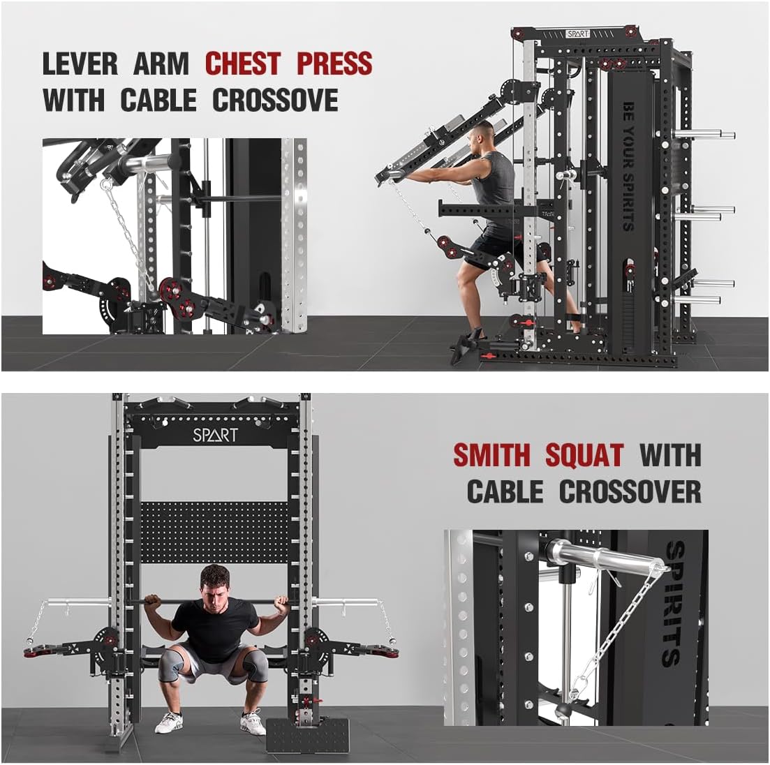 All-in-One Home Gym System: This home gym machine offers everything you need, comes with aluminum pulley set. This multi-functional home workout equipment integrates a power cage, narrow and wide cable crossover, smith machine, lat pull down, dipping, vertical leg press, chest press, lever arm, pull up, seated row, chin up, belt squat, bench press, battle rope, landmine and leg raise—allowing you to perform full-body workouts from the comfort of your home.