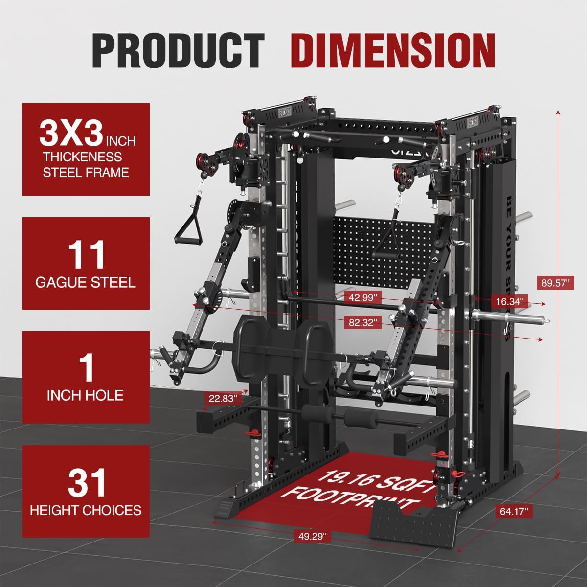 Professional Commercial Smithe Machine: The Smithe Machine with Cable Crossover and Leg Attachment is made of 3”x3” industrial steel and reinforced joints for 3600lb capacity. Overall dimensions are 49″L x 64″W x 89″H with multiple 1” holes. Heavy-duty base stabilizers prevent wobble during kipping pull-ups, while rubberized floor protectors safeguard hardwood surfaces—ideal for basement gyms or garage workout areas.