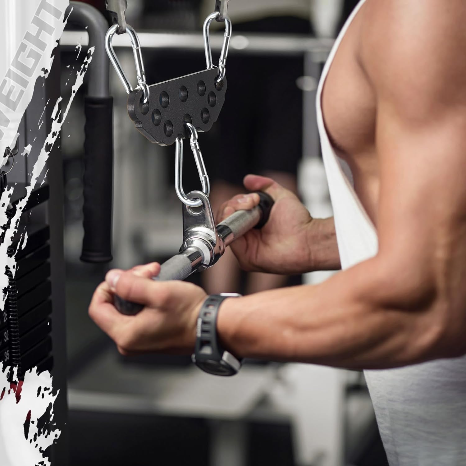 Enhanced Compatibility with Accessories: not just for cable machines, this attachment connects with various handles, such as D handles and V handles, as well as the multi-grip lat pull down bar and tricep ropes, enhancing your gym’s versatility and potential.