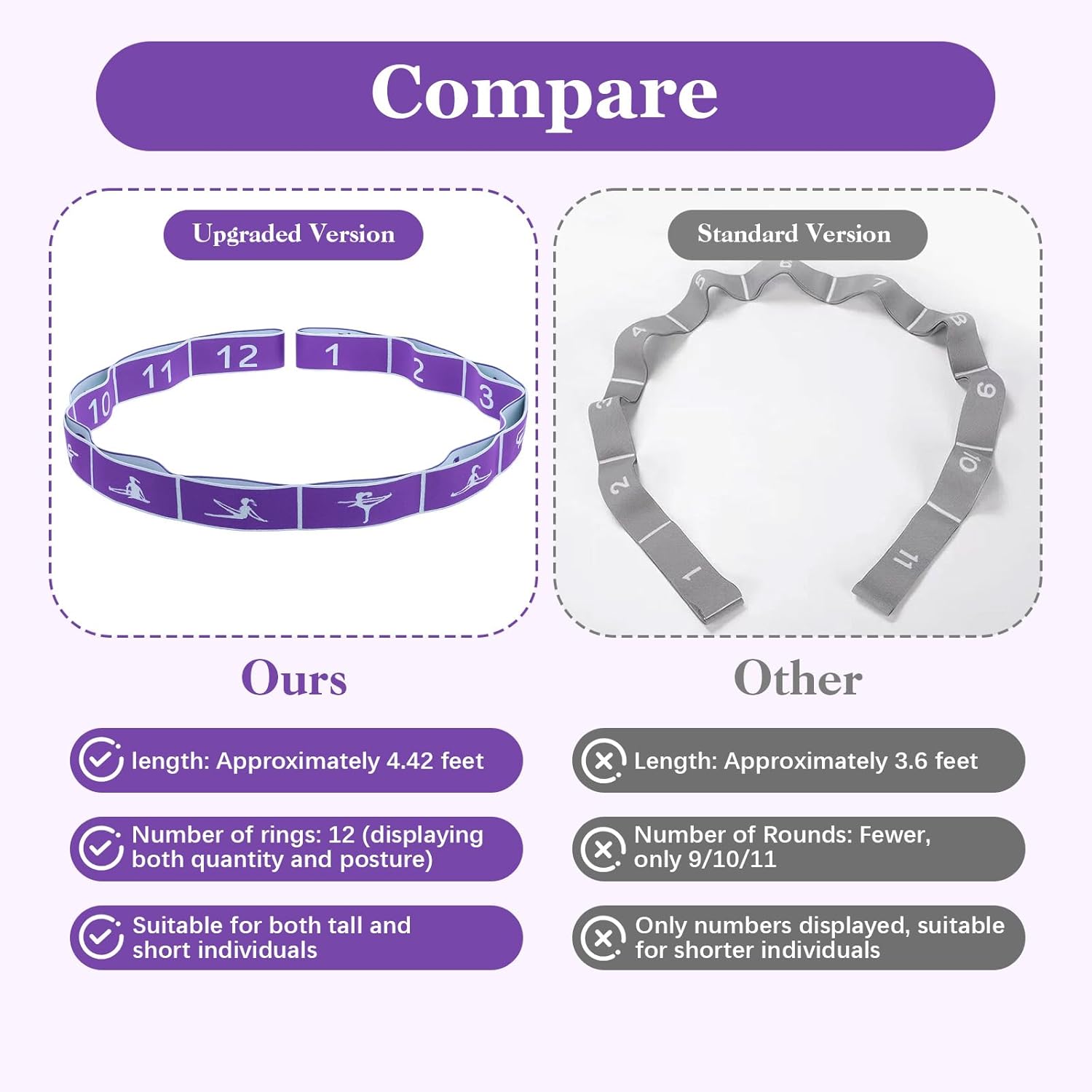 【Upgraded Design】This stretch strap features an upgraded 12-ring design embroidered with various yoga poses for easy reference. It offers multiple grip positions suitable for various stretching exercises. Our stretching bands are measuring 135 x 4cm/53.14 x 1.57inch, the extended design ensures comfortable use for people of different body types during yoga practice, Pilates, and physiotherapy classes.