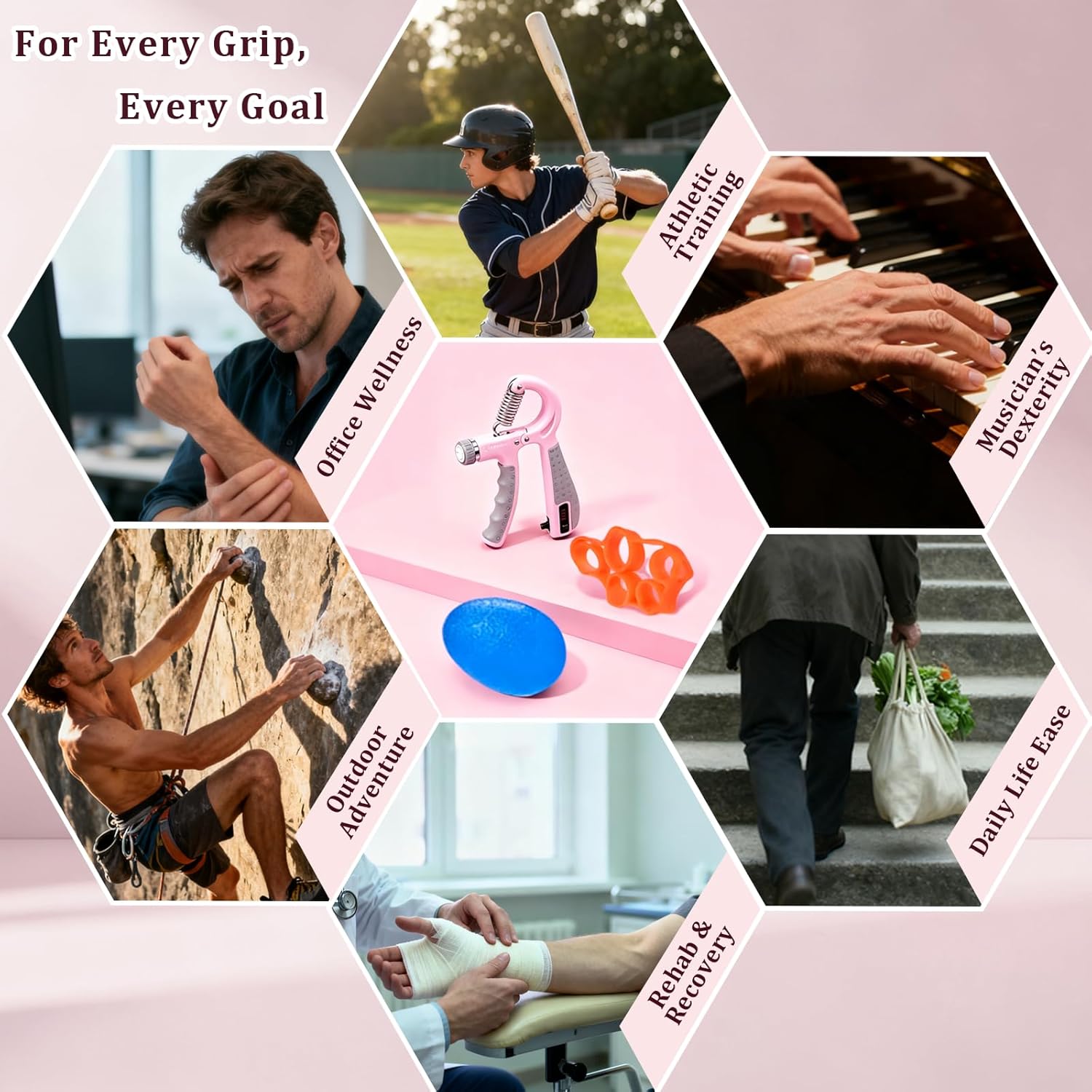 🎯 Boost Sports & Music Performance – Increase grip power for weightlifting (hold heavier weights), climbing (grip rocks/holds longer), tennis/golf (better racket/club control), boxing; improve finger dexterity for guitar/piano/drums (faster, more precise movements).