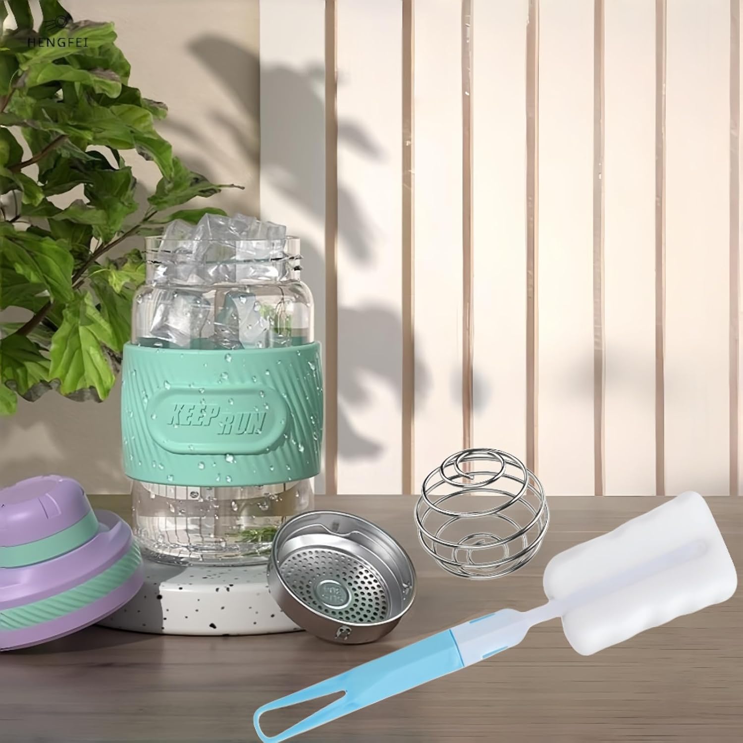 Silicone Sleeve and Brush: in the middle of the shaker bottle, made of thickened silicone material with deep lines, easy to grip; and the brush is the right length to easily clean the bottle
