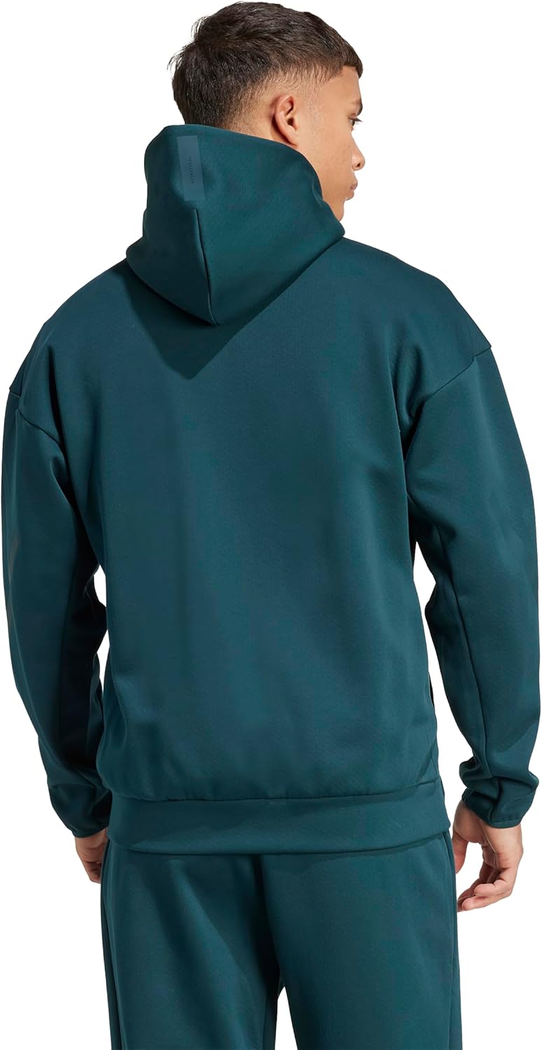 Stay focused in the ADIDAS Z.N.E. full-zip hooded track jacket, designed to keep you ready for action. The regular fit ensures balanced comfort, while the three-layer doubleknit fabric locks in warmth during cold weather. A full zip with a high collar and hood provides complete coverage, ideal for staying cozy during winter activities. Front zip pockets offer secure storage for small essentials. Made from 57% recycled polyester and 43% cotton doubleknit, it delivers on both function and design.