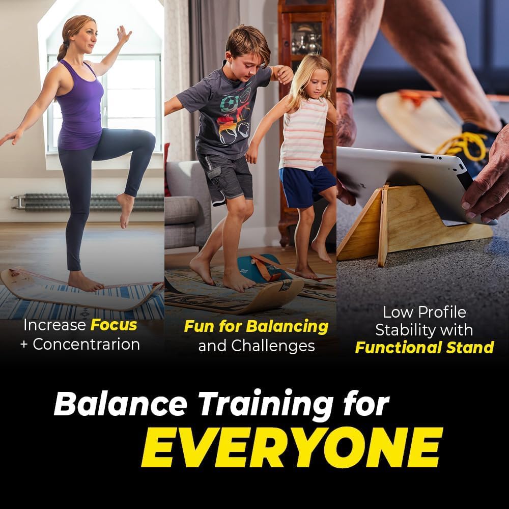 ADAPTIVE EXERCISE BALANCE BOARD FOR DIVERSE LIFESTYLES: This versatile workout board is perfect for home, outdoor, or office use. You can even use it as a balance board for standing desks. Its portable design supports agility training and can be used as yoga accessories, skateboard trainers, a snowboard trainer, core trainer and pickleball practice. The included slack line board stand doubles as a tablet holder, letting you stream workouts for an enhanced fitness experience.