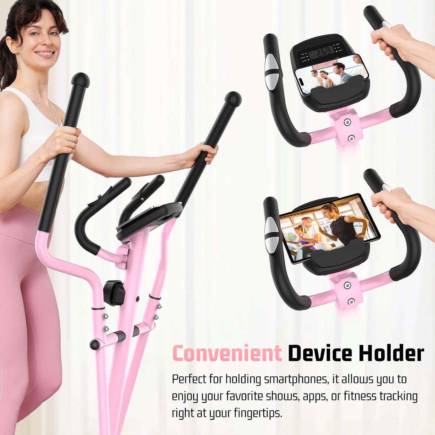 Smart Tracking Keeps You Motivated – Ancheer compact elliptical features dual handlebar design with built-in pulse sensors in the stationary grips that track your heart rate in real-time while you exercise. Home Gym Cardio Machines with clear LCD digital display automatically tracks your 6 core data including time, speed, distance, calories, pulse, and total odometer. Plan your workouts based on real progress! Plus, the device holder lets you watch videos or jam to music while you workout.