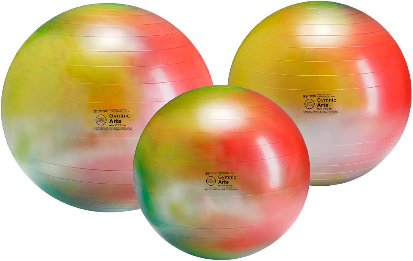 The Gymnic Arte Plus Burst-Resistant Exercise Ball is a multi-functional piece of equipment that can be used for both fitness activities as well as physical therapy practices. Use the Gymnic Plus Burst-Resistant Exercise Ball at home, the office, or at the gym to perform a wide range of exercises to help improve balance, coordination, flexibility and stabilization. This piece of equipment easily integrates into your daily routine; simply adjust the inflation intensity in order to customize the stability level you need. Push your workout to new heights by engaging more muscles groups at a time. By incorporating balance-centric exercises into your workout, it enables your muscles to work harder to stabilize your body. This helps intensify your workout which in turn, burns more calories. Made from durable, latex-free, vinyl which supports a maximum weight of 270 lbs. and is also phthalate and BPA free. The burst-resistant quality of this exercise ball is possible because of the medical grade resilient material it is made out of. Besides providing high performance and increased safety during use, if the exercise ball is punctured it will deflate slowly, protecting the user from harm. The 55 cm exercise ball is recommended for users 5′ 1″ to 5′ 7″. The 65 cm exercise ball is recommended for users 5′ 8″ to 6′ 2″. The 75 cm exercise ball is recommended for users 6′ 3″ and taller. Due to the unique nature of this product no two exercise balls will be the same color; suitable for ages 5 and up.