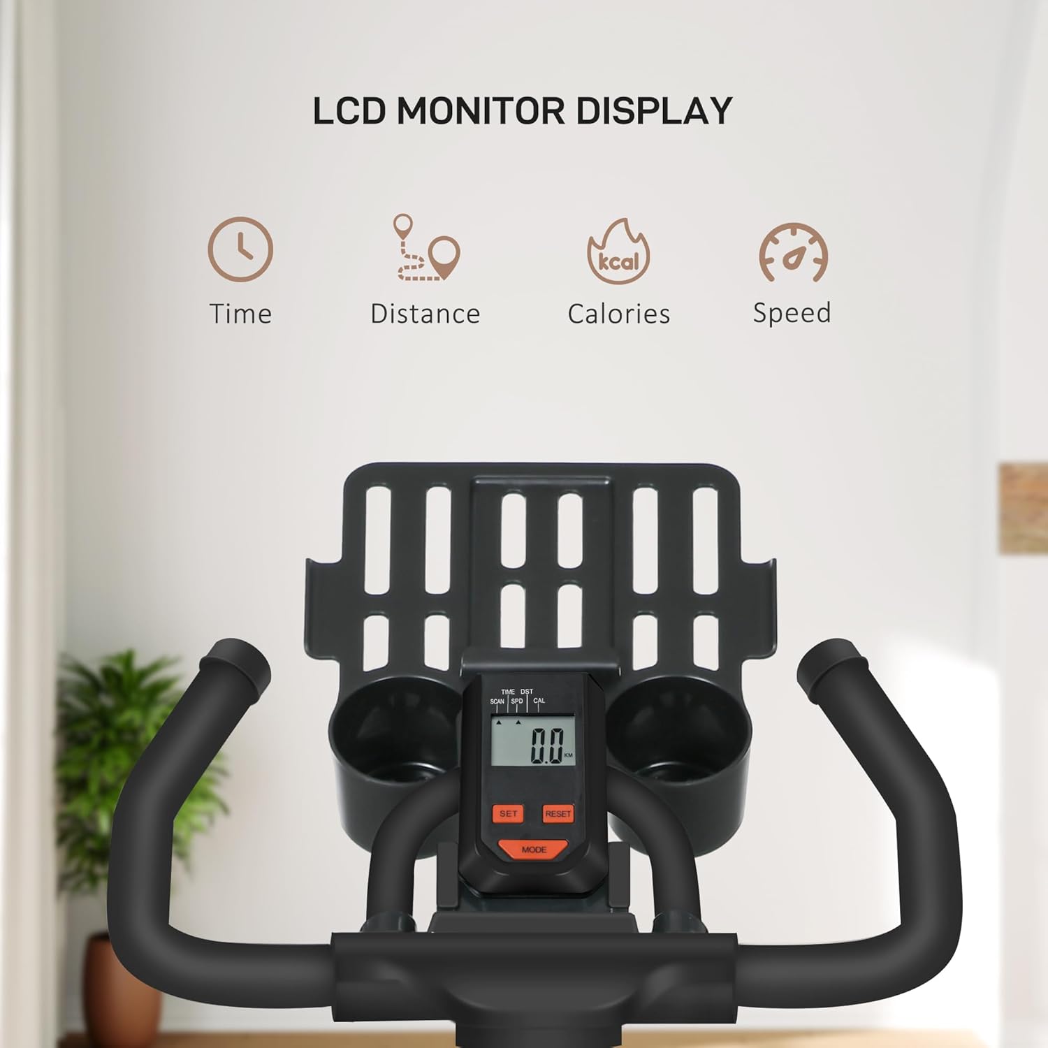 LCD Monitor and Tray Holder: This stationary bike’s featured LCD monitor display screen shows workout time, speed, distance, and calories burned. Features a tray for holding miscellaneous items such as water bottles and phones