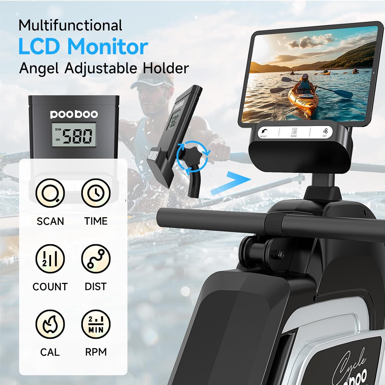 Large Monitor and Tablet Holder: Easy-to-read LCD monitor clearly displays your distance,rowing time, count, total count and calories. Pre-set your training goal. Upgraded dual-line sensing, more accurate data, tablet holder angle adjustable for a better view