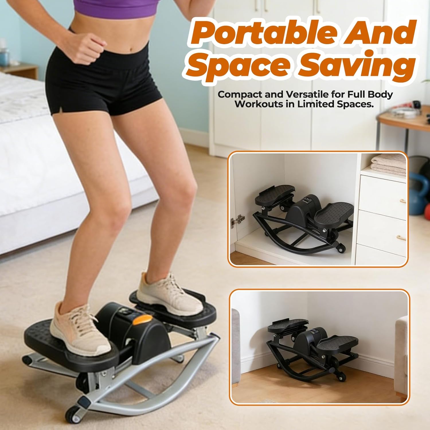 【Space-Saving for Full Body Workouts】Ideal for small spaces, this compact rocking stepper delivers a powerful side to side stepper cardio session. The included resistance bands turn it into versatile step fitness machines for a complete home gym experience.