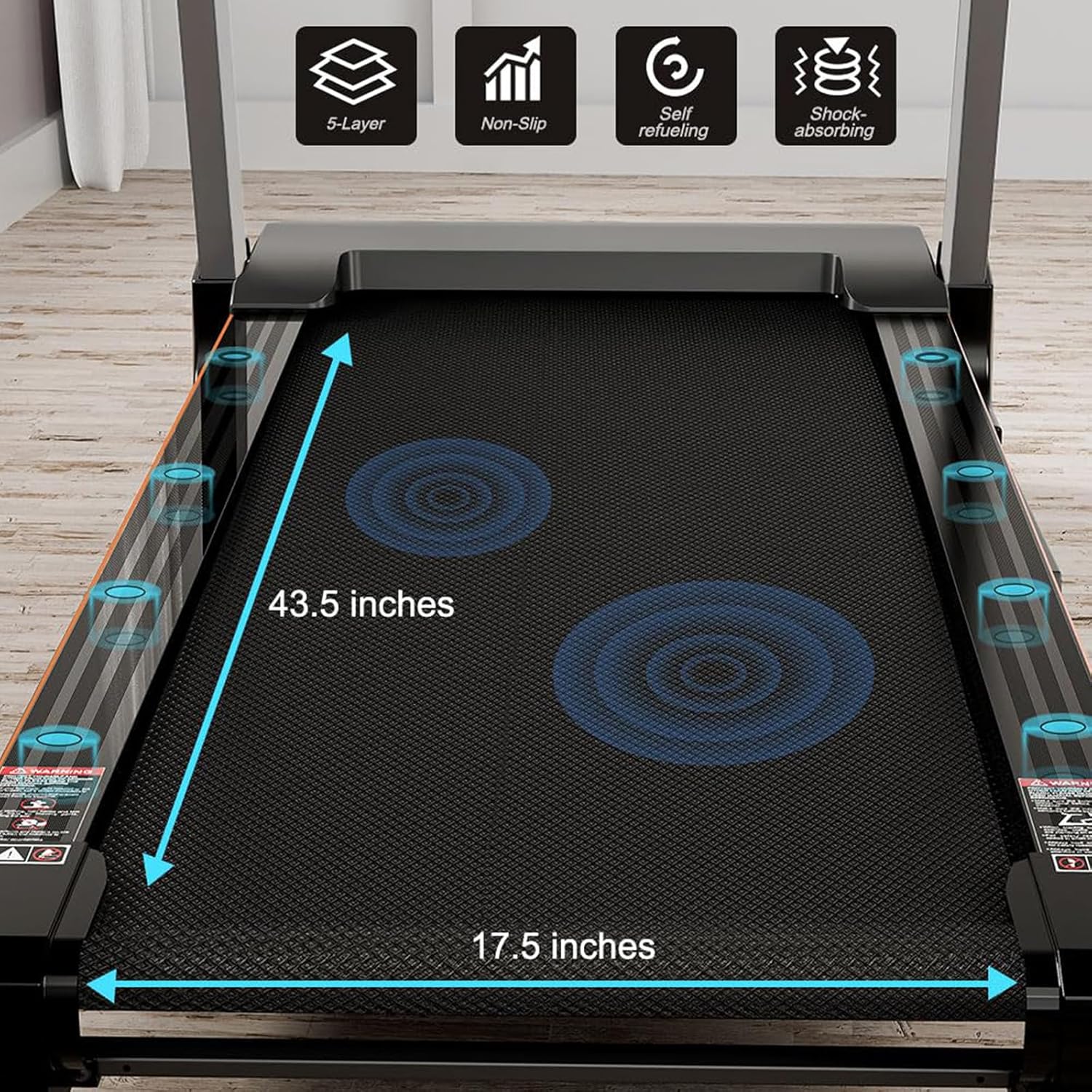 Almost 18 Inch Wide Belt & Shock Absorption: The 7-layer non-slip shock-absorbing running belt protects your knees and ankles, while the 43.5 x 17.4 inch wide and long belt provides ample room for comfortable strides. The folding treadmill’s sturdy steel frame and 4 silicone column supports ensure stability. This electric treadmill with handle bars supports up to 300 lbs, ideal for particularly tall or heavy people.