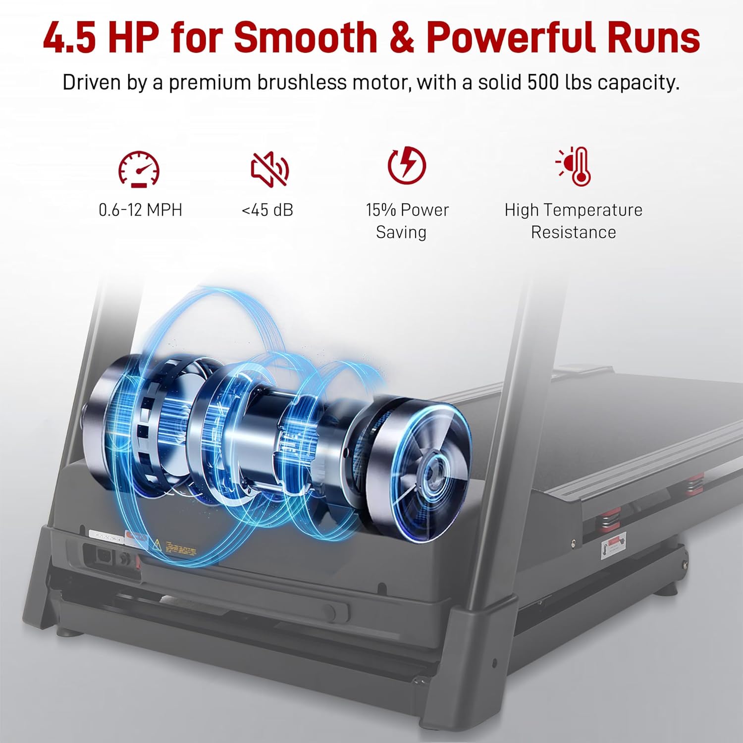 【Upgraded 4.5 HP Motor & 500 LB Capacity】Equipped with a durable 4.5 HP brushless motor, this heavy duty treadmill with 500 lb capacity delivers smooth acceleration and ultra-quiet operation up to 12 MPH. The reinforced steel frame enhances stability and durability, making it a dependable treadmill for home training at any intensity.