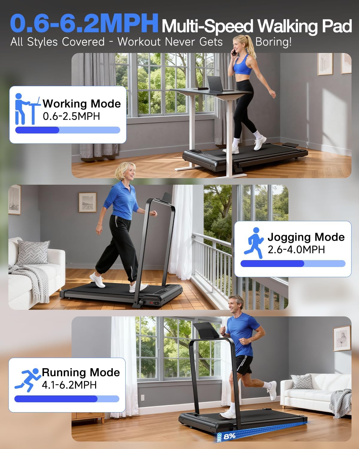 【Get Fit on Your Terms】Ditch the boring flat walk—8% manual incline treadmill torches 40% more calories—targeting your glutes and legs as you mimic outdoor hiking! Pair it with the versatile speed range: slow walk (0.6-2.5mph) for steady fat burn, jog (2.6-4mph) for heart-pumping cardio, or run (4.1-6.2mph) for intense HIIT. One small treadmill = endless workout possibilities!