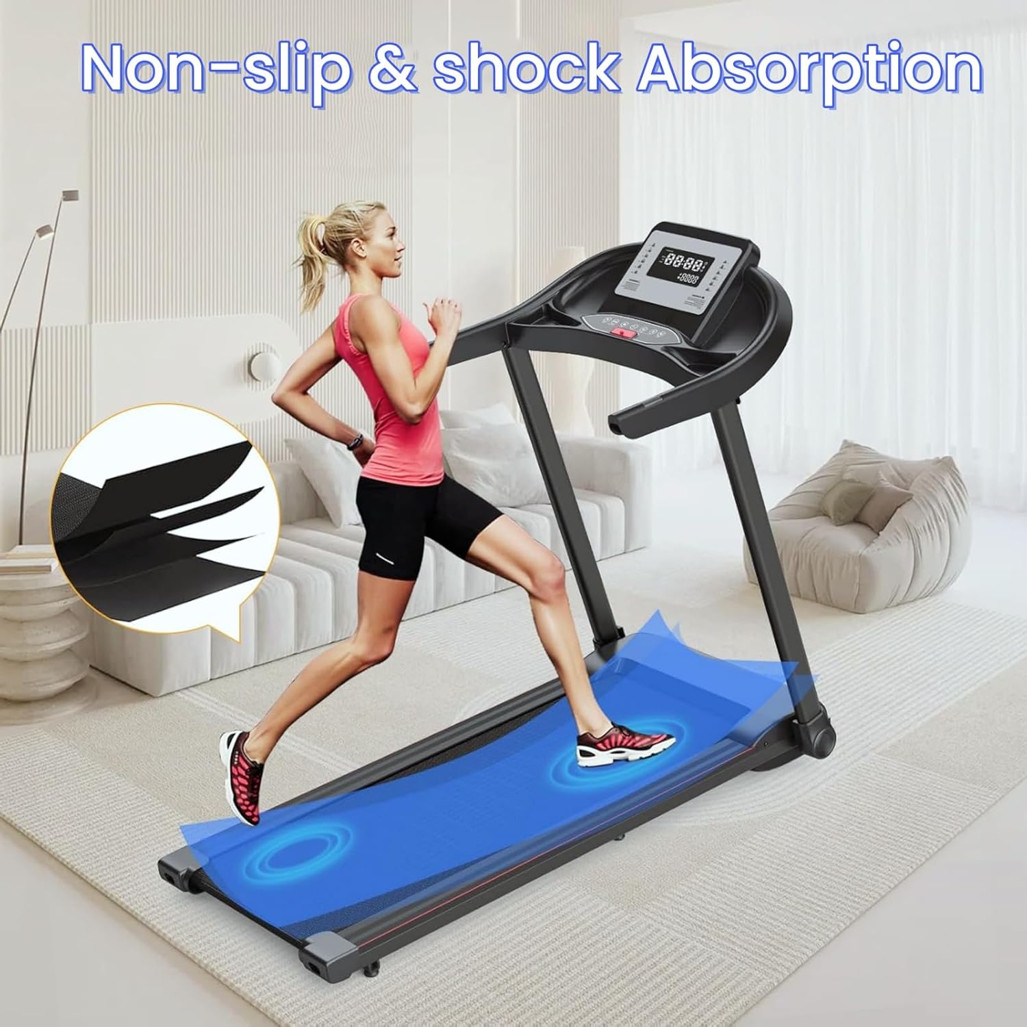 High-Performance Motor: The treadmill is equipped with a powerful 2.5hp brushless motor that ensures a smooth and efficient. This motor is designed for longevity and low noise, operating at less than 45 db.The maximum weight capacity is 265 lbs
