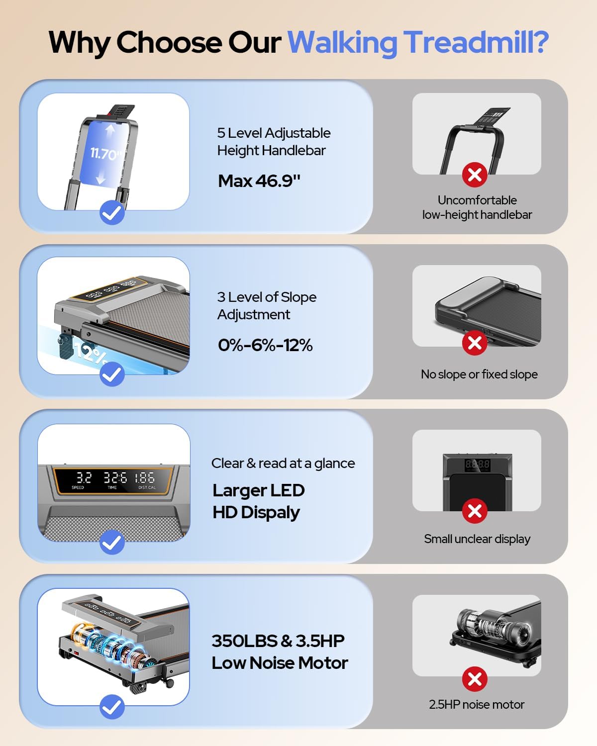 【Quiet 3.5HP Power Built for Apartments & Shared Spaces】 Equipped with a 3.5HP motor supporting up to 350 lbs, this walking pad treadmill with incline runs smoothly and quietly without disturbing your home or office. Reinforced frame and stress-resistant motor pass rigorous tests (100,000+ impacts, 8-hour runs), ensuring long-lasting durability. Track time, speed, distance, and calories in real time on the LED display.