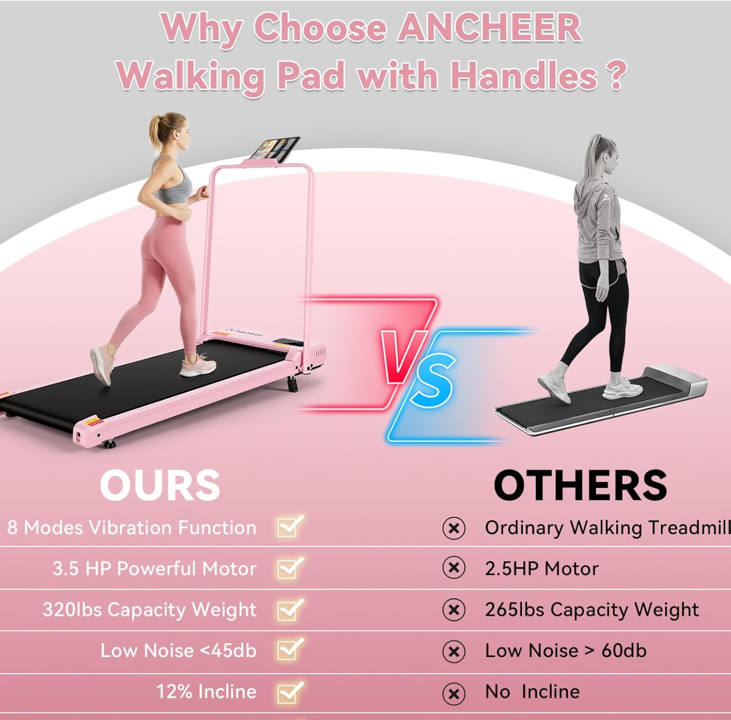 【Adjustable 12% Incline Treadmill 】ANCHEER walking pad with handle bar offers a unique 12% manual incline, It simulates the climbing effect more realistically to target specific muscles such as the buttocks and calves, increasing calorie burning by three times. you can tailor your workout to meet your fitness goals, enhancing your home exercise experience