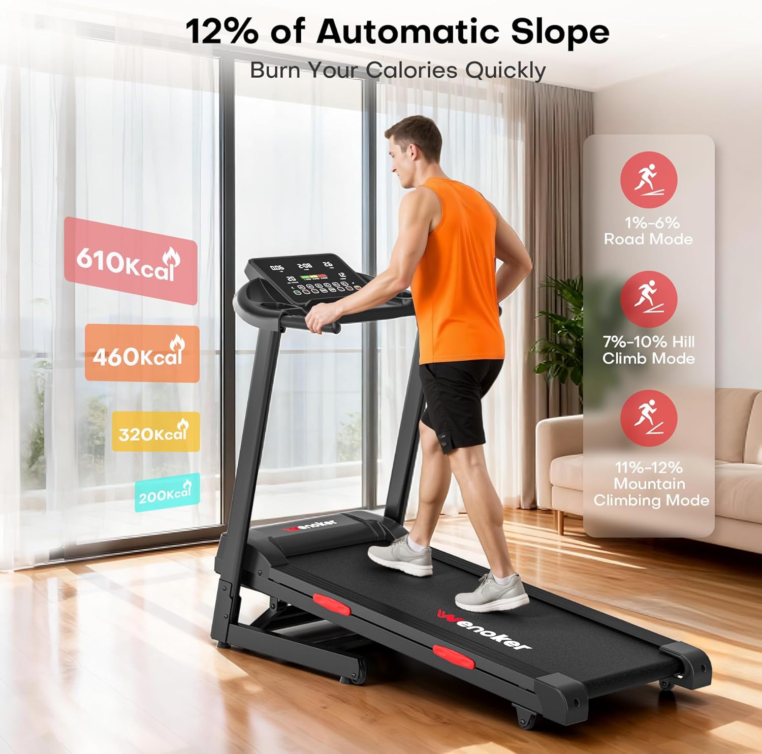 [Auto Incline & Shortcut Keys] The WENOKER treadmills for home can achieve 12 levels of automatic tilt adjustment through the tilt control button. Three incline shortcut keys enable immediate tilt changes, recreating the real scene of uphill running. Three speed shortcut keys allow for easy speed adjustments, enhancing strength training and increasing calorie consumption. It’s perfect for users seeking added variety and intensity during home workouts.