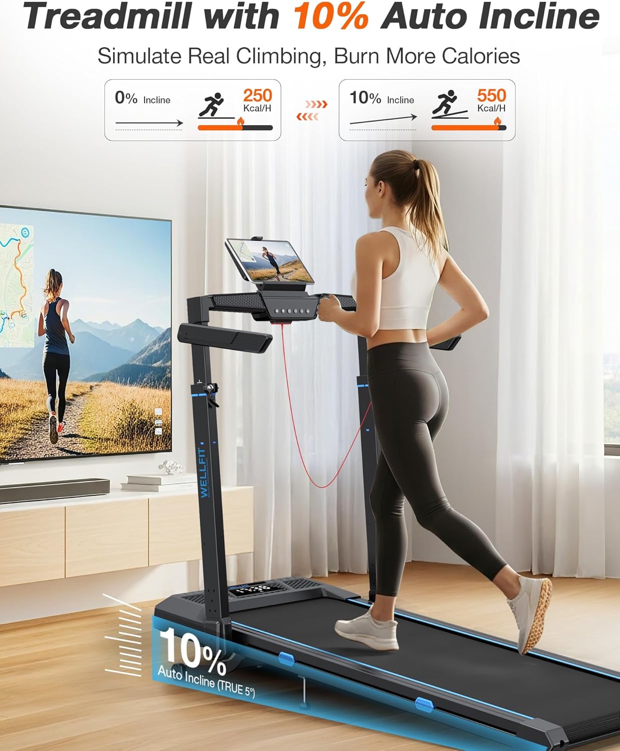 【10% Auto Incline Treadmill】The Wellfit walking pad treadmill features a 0–10% automatic incline, simulating uphill walking and climbing to make workouts more challenging and effective. It targets key muscles like glutes, legs, and calves, while boosting endurance and calorie burn. Suitable for all fitness levels.