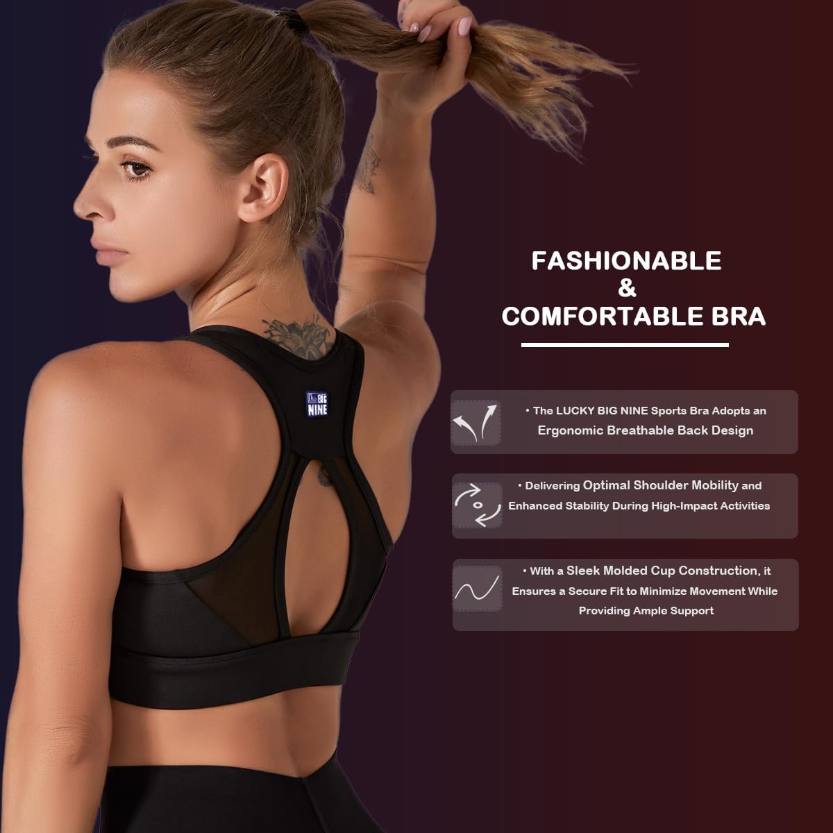[Fashionable & Comfortable Bra] The LUCKY BIG NINE Sports Bra Adopts an Ergonomic Breathable Back Design, Delivering Optimal Shoulder Mobility and Enhanced Stability During High-Impact Activities. With a Sleek Molded Cup Construction, it Ensures a Secure Fit to Minimize Movement While Providing Ample Support.