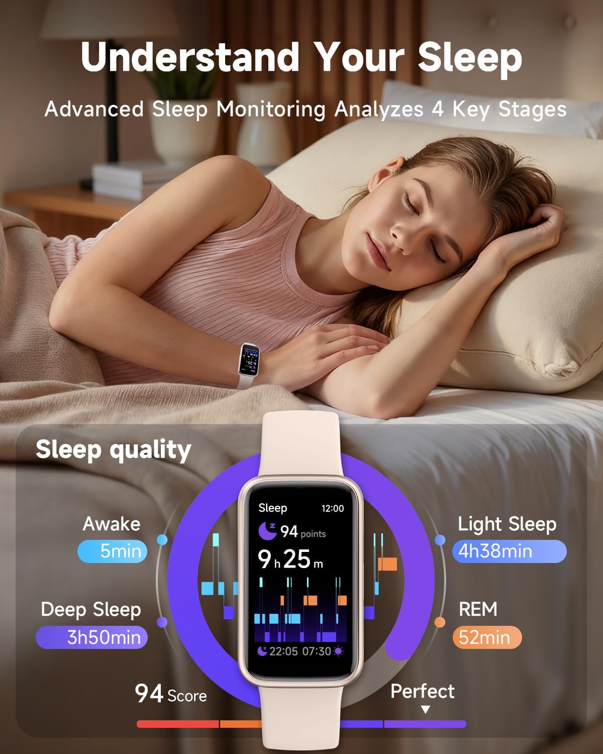 Sleep Monitor with Professional Analysis: Understand your rest like never before. This pedometer watch accurately tracks four sleep stages—light, deep, REM, and awake—and provides a sleep quality score along with practical tips for improvement.