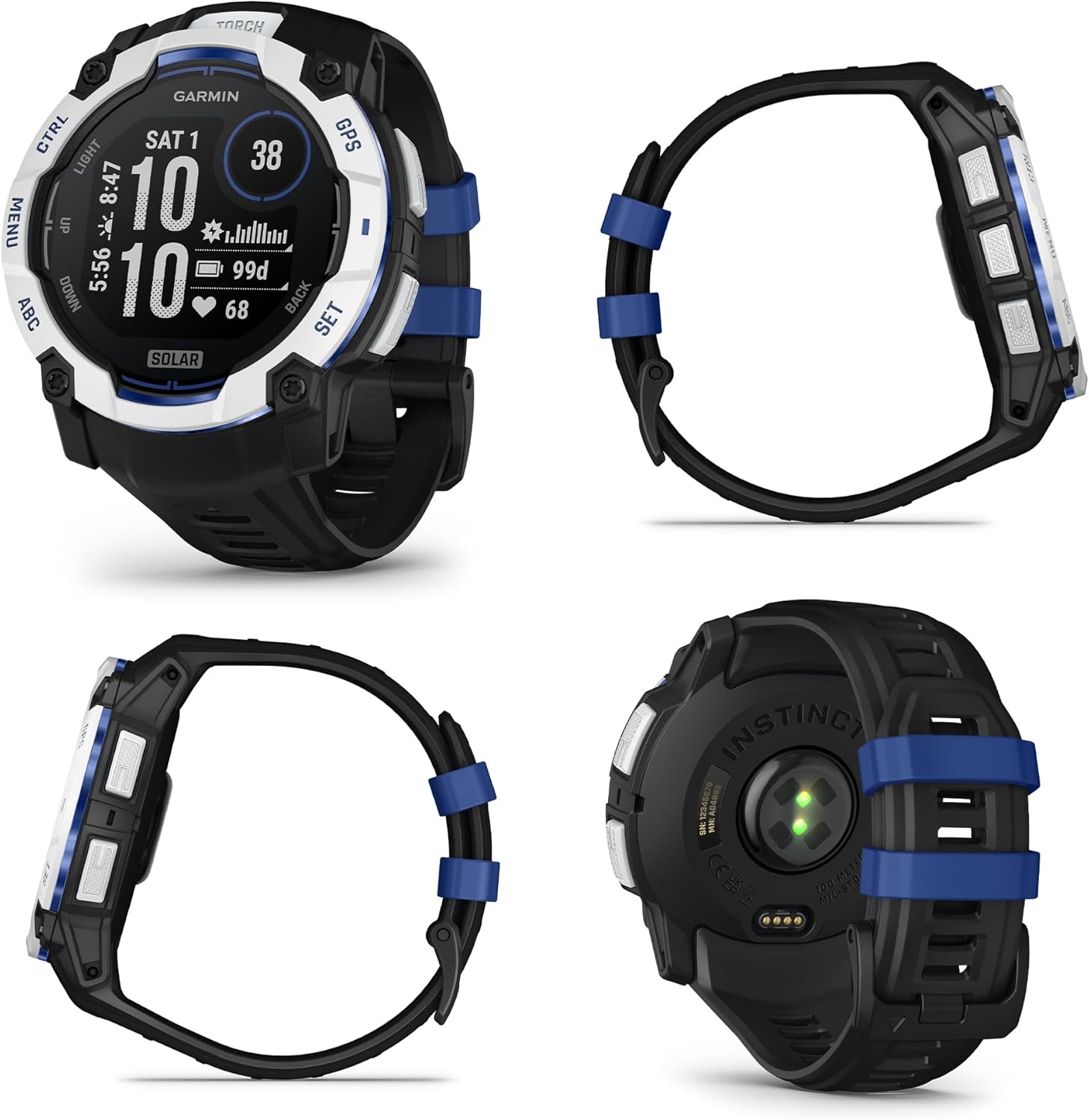 Garmin Instinct 3 Solar Rugged GPS Smartwatch, 50 mm Case, Unlimited Battery with Solar Charging, Multi-Band GPS, Built-in Flashlight, Whitestone with Black/Bolt Blue Band (Supernova Collection)
