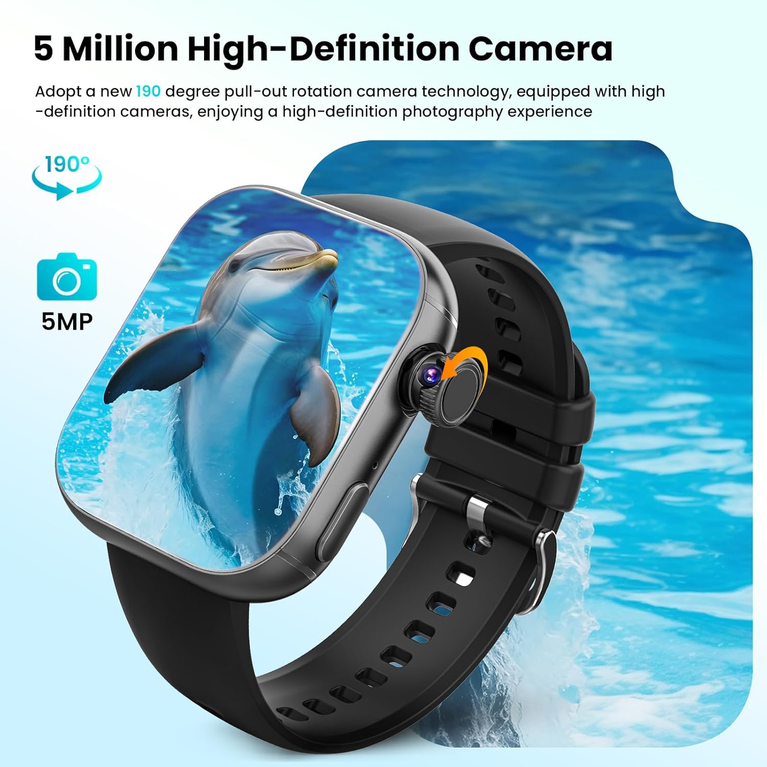 【Rotatable Camera & Security Features】 Our intelligent smart watch have 190°pull-out rotatable camera enables multi-angle shooting and video calls. Facial recognition prevents data leakage, while SOS emergency call with dual-satellite GPS ensures precise outdoor positioning