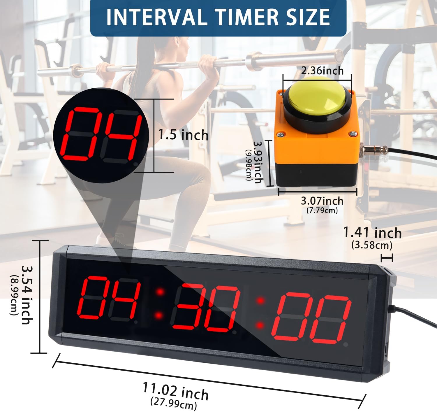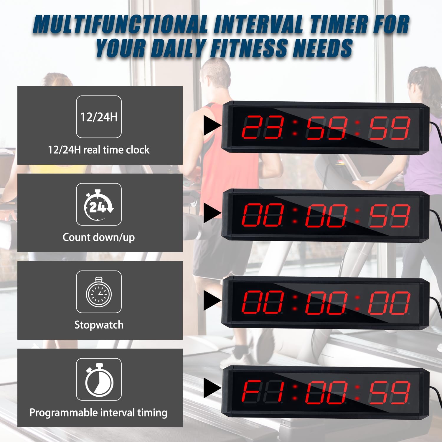 fitness timer:This is a multifunctional fitness timer that supports a 12-hour, 24-hour real-time clock, countdown, positive timing, stopwatch, and customized interval mode, and has a stopwatch switch button to meet all your training needs in different venues, of course, Can also be applied to your daily life