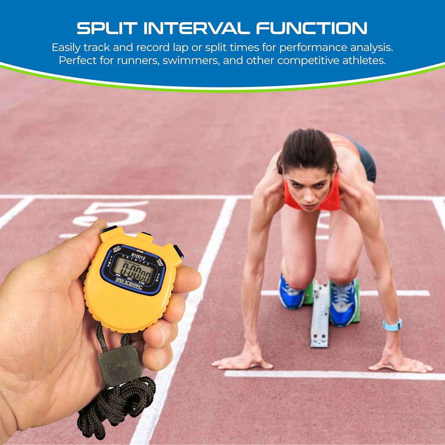 SPLIT INTERVAL FUNCTION: Easily track and record lap or split times for enhanced performance analysis. Perfect for runners, swimmers, and other competitive athletes.