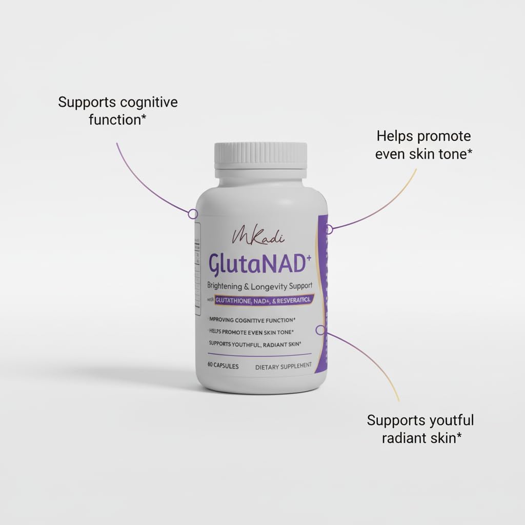 MKADI GlutaNAD+ is a daily vegan supplement designed to support radiant skin, cellular energy, and healthy aging from within. Each serving combines L-Glutathione, NAD+, NAC, Resveratrol, and a targeted antioxidant complex to help defend against oxidative stress and promote a brighter, more even-looking complexion.* MKADI L-Glutathione (300 mg) is known as the “master antioxidant” and helps reduce oxidative stress while supporting a more luminous, balanced skin tone. NAD+ (250 mg) is an essential coenzyme for cellular repair and energy production, helping maintain youthful vitality. N-Acetyl-L-Cysteine (NAC), Resveratrol, Vitamin E, Selenium, Green Tea, and Pine Bark Extract work together to nourish skin, support natural detox pathways, and protect cells from environmental damage.* MKADI GlutaNAD+ is vegan, non-GMO, and free from gluten, soy, and dairy, and is made in a GMP-certified facility in the USA for quality you can trust.* Suggested use: take 2 capsules daily with food or as directed by your healthcare provider.* MKADI Disclaimer: These statements have not been evaluated by the Food and Drug Administration. This product is not intended to diagnose, treat, cure, or prevent any disease.