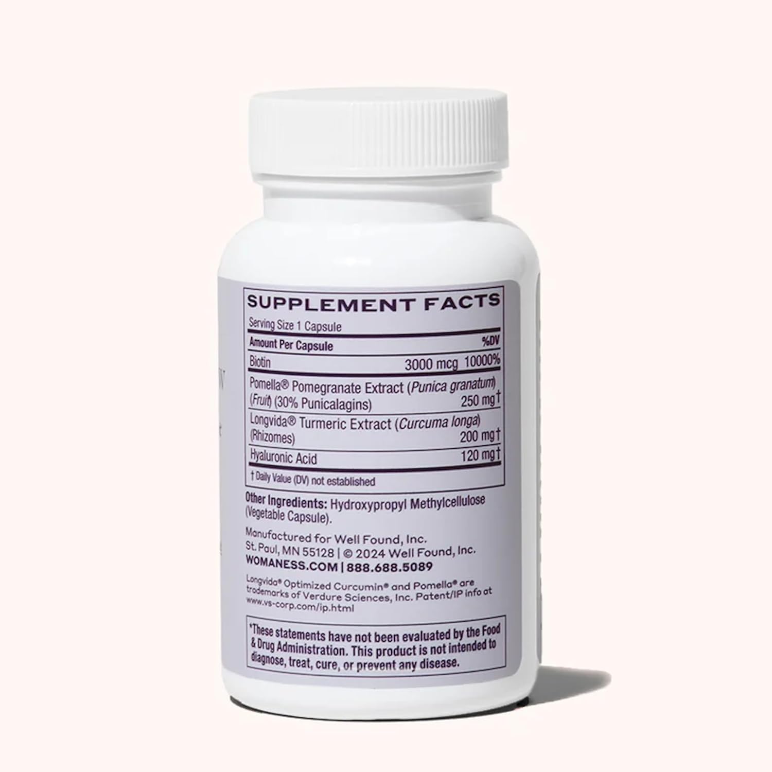 SKIN HYDRATION, ELASTICITY & GLOW FROM WITHIN: Formulated with hyaluronic acid and antioxidant-rich Pomella pomegranate extract, this hair, skin, and nails supplement helps support moisture retention, skin elasticity, and a healthy glow. Designed for women experiencing dry or dull skin, it supports smoother, more radiant-looking skin from within