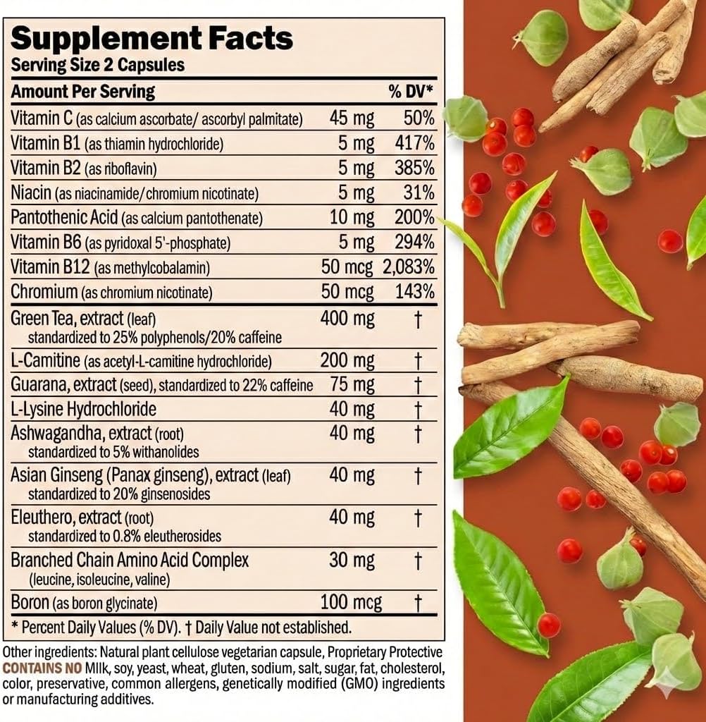 Superior pure bio-active ingredients – Provides optimum levels of B-Complex Vitamins, Chromium, Carnitine, Lysine, Vitamin C, Green Tea, Guarana, Panax Ginseng, Eleutherococcus, Ashwagandha, Boron and branched chain amino acids (Leucine, Isoleucine, and Valine). Contains no Milk / Dairy-Free, Gluten Free; no soy, yeast, wheat, sodium, salt, sugar, fat, cholesterol, color, preservative, common allergens or manufacturing additives.