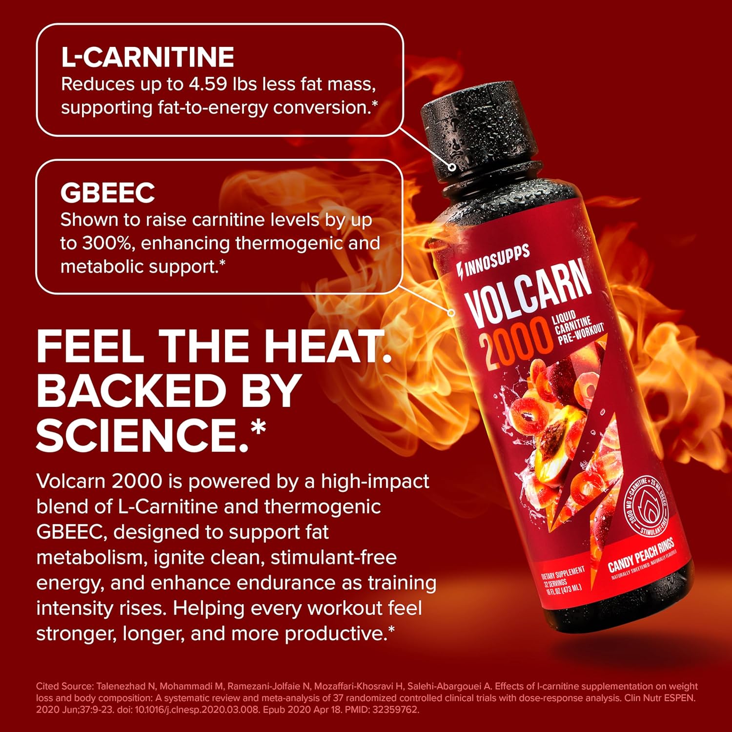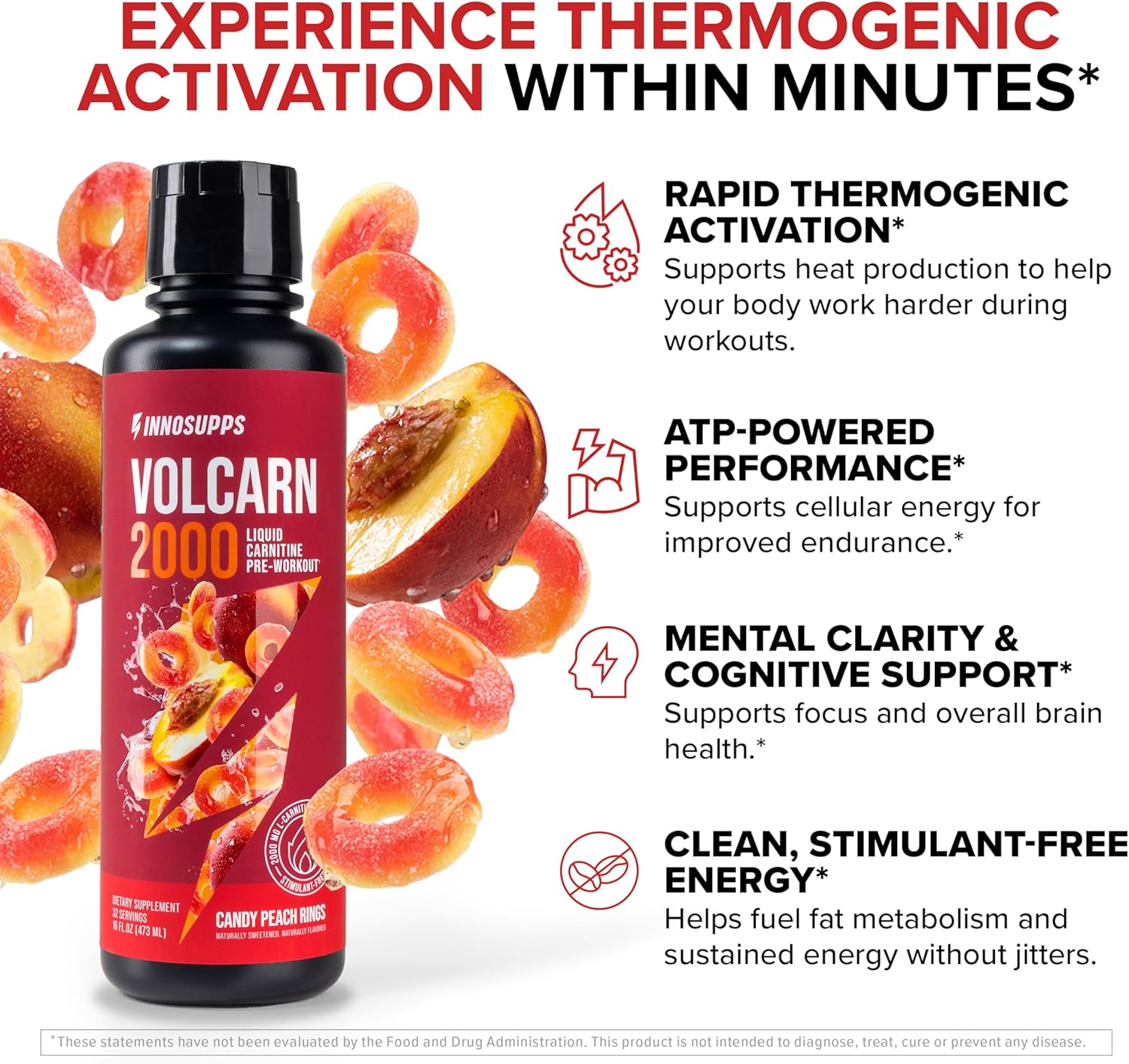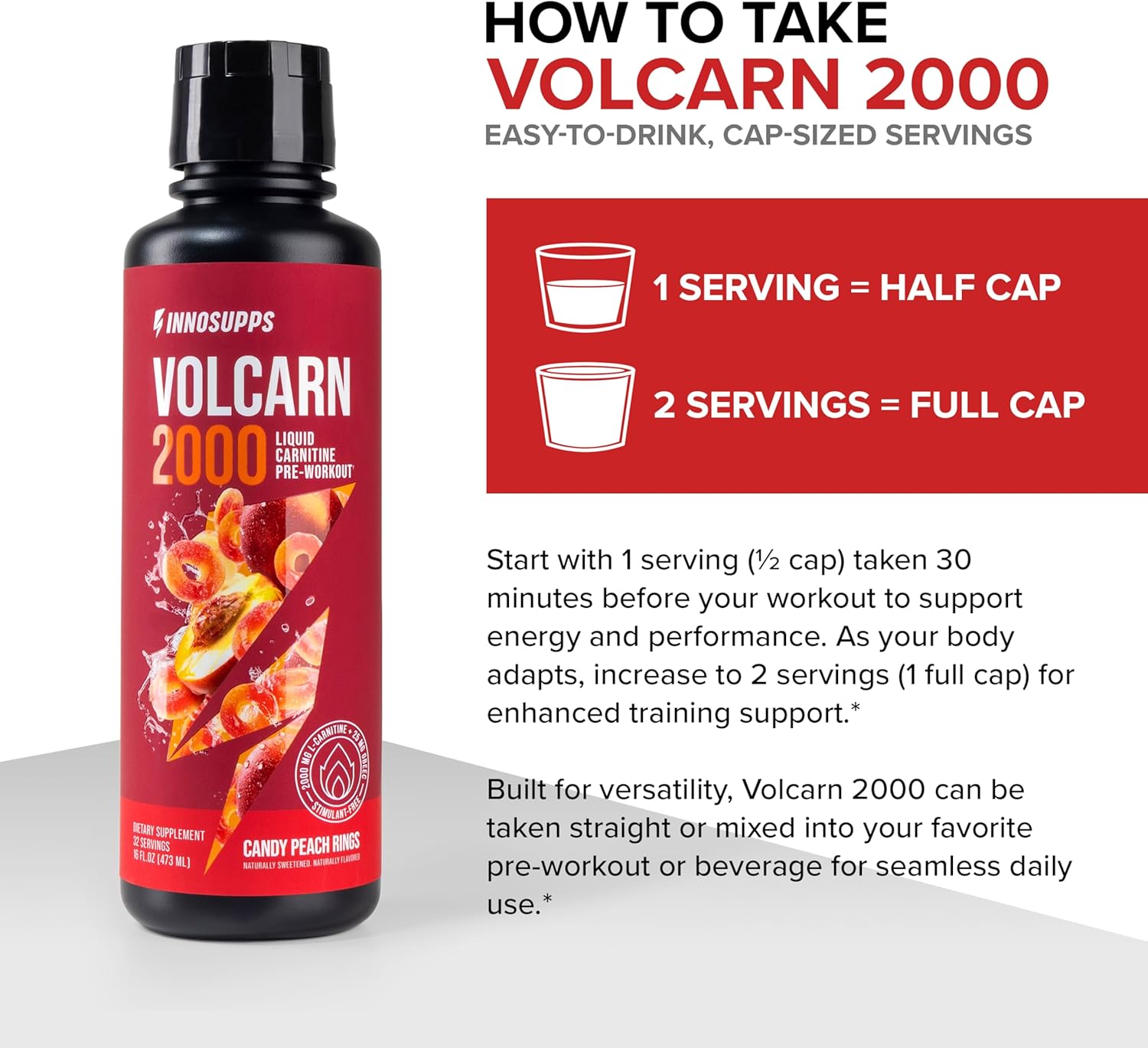 InnoSupps Volcarn 2000 – L-CARNITINE Advanced Energy Liquid | ATP Enhancer with GBEEC | Boosts Energy, Enhances Focus, Caffeine Free, No Artificial Sweeteners | 32 Servings (Candy Peach Rings)