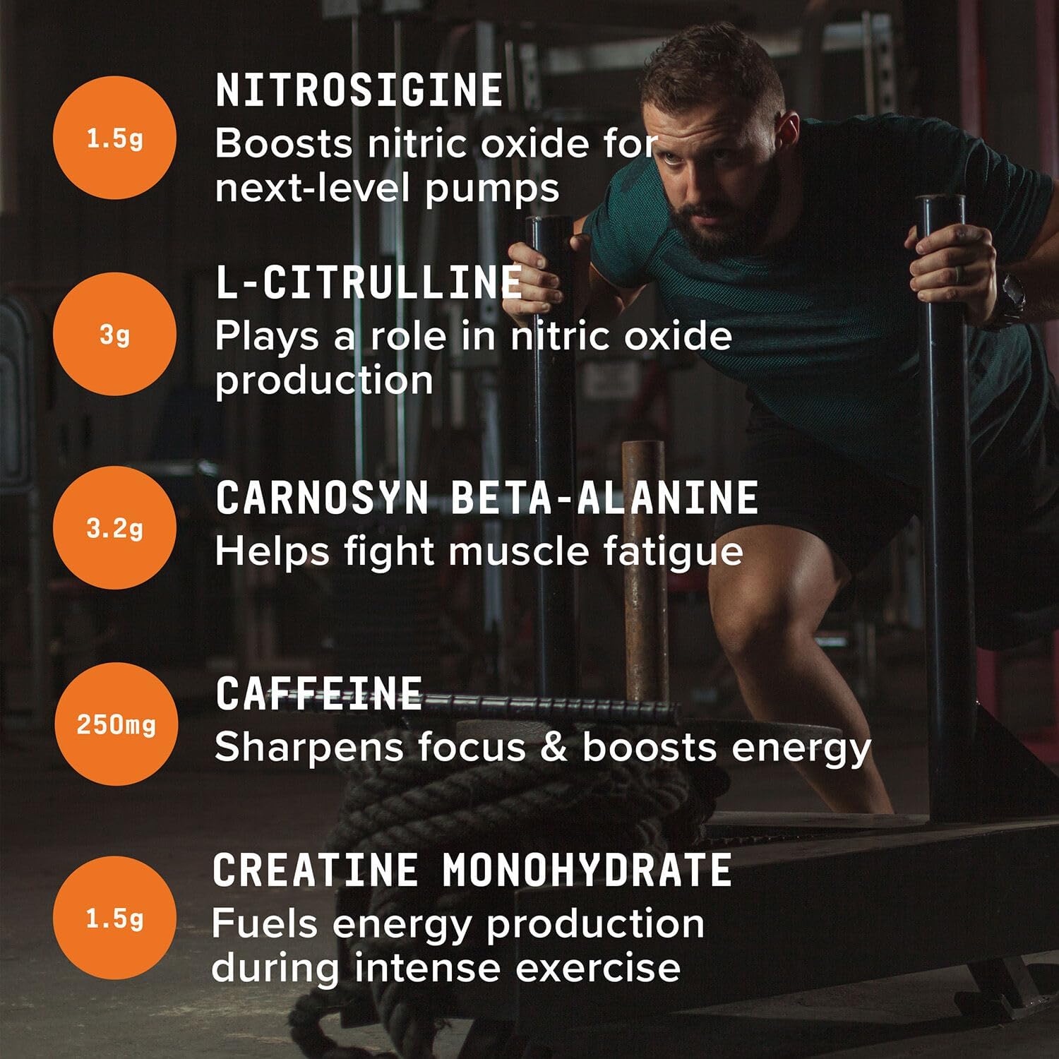3g of L-citrulline + 1.5g of L-arginine, which are two amino acids that play a role in the production of N.O. for extreme muscle pumps.