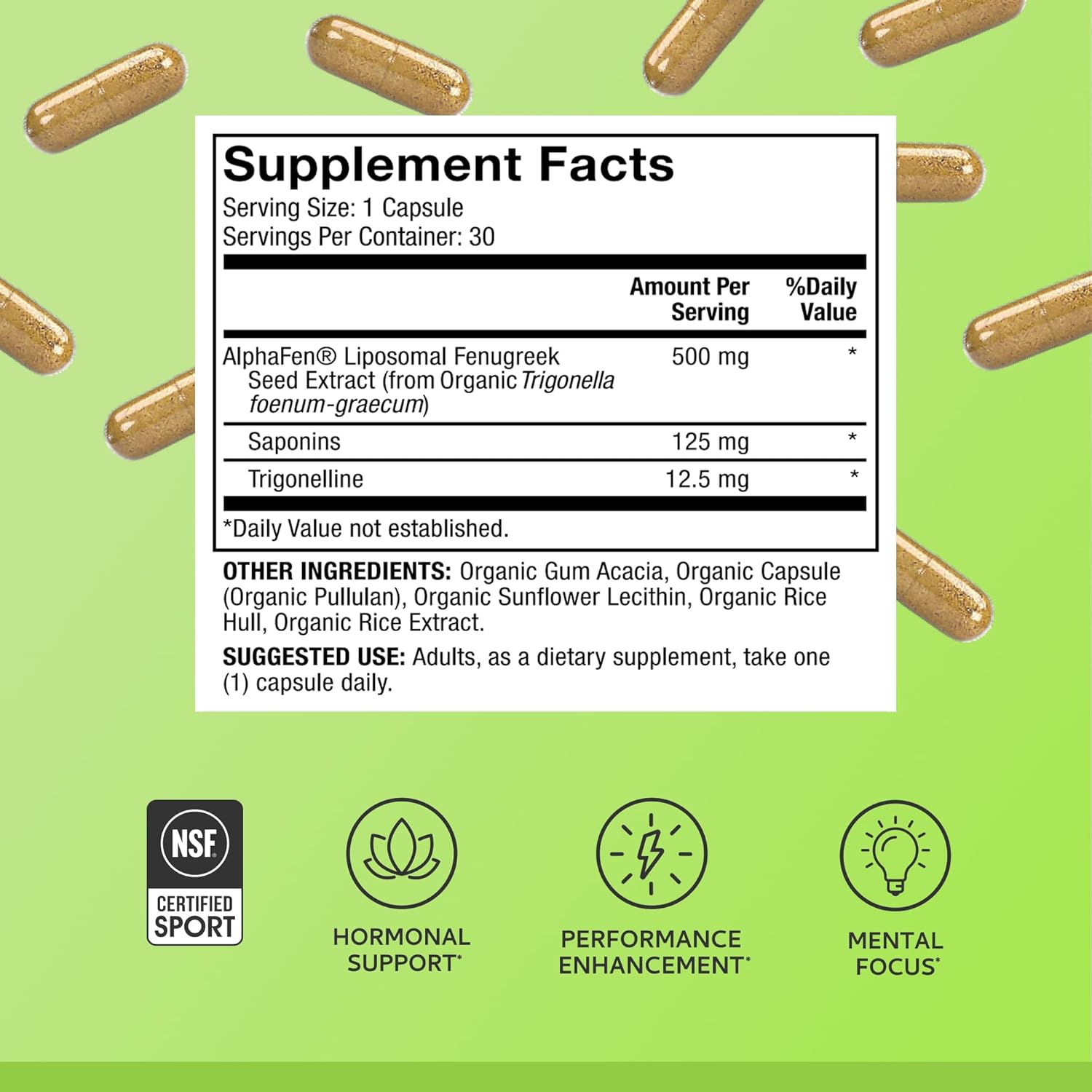 This patented formula delivers 500 mg of AlphaFen Liposomal Fenugreek Seed Extract from Organic Trigonella foenum-graecum, standardized for two of the plant’s most studied bioactives: 125 mg of saponins and 12.5 mg of trigonelline per one (1) capsule serving