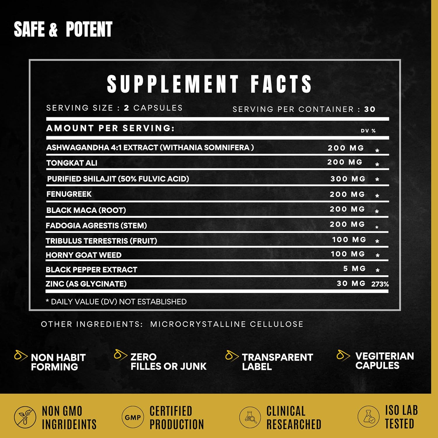 Energy, Vitality & Endurance Support: Ashwagandha Shilajit & Black Maca supports energy and focus, endurance for men, and overall vitality, helping you feel active and resilient throughout the day.