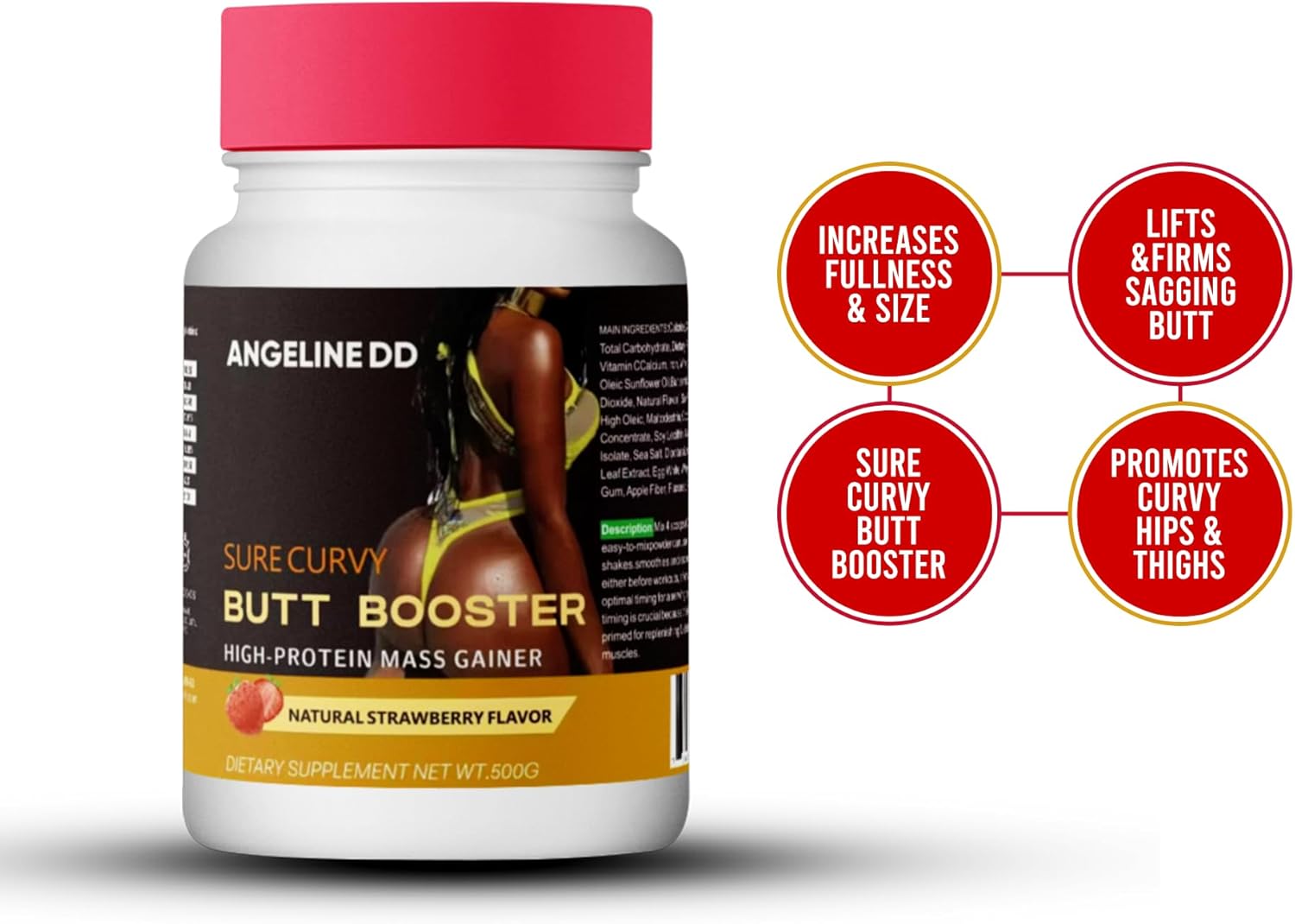 ANGELINE DD Sure Curvy Butt Booster is a premium high-protein mass gainer powder designed to help enhance curves naturally by supporting healthy weight gain and muscle growth in the hips and glutes. This advanced formula provides clean, high-quality protein to help you build a fuller, rounder, and more defined shape. With its delicious Natural Strawberry Flavor, it mixes smoothly into any drink—milk, smoothies, water, or juice. Perfect as a daily supplement, post-workout shake, or calorie-boosting snack for women aiming to achieve a curvier, more sculpted silhouette. This formula is made with quality ingredients that help: ✔️ Support glute & hip muscle growth ✔️ Enhance natural body curves ✔️ Promote healthy weight gain ✔️ Improve shape definition without excess fat ✔️ Increase daily energy and nutrition intake If you want an easy, tasty, and effective way to reach your body-goal journey, ANGELINE DD Butt Booster is your perfect daily companion.