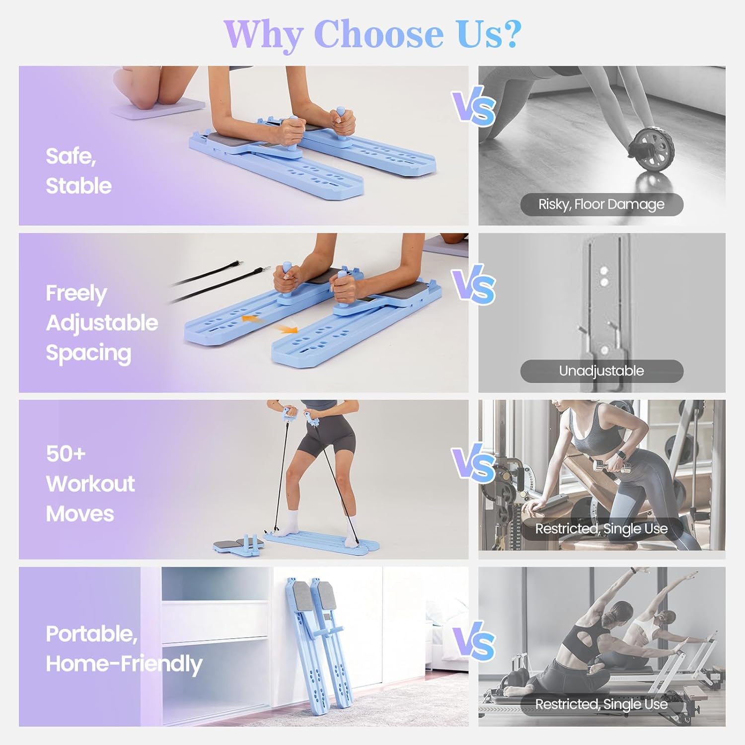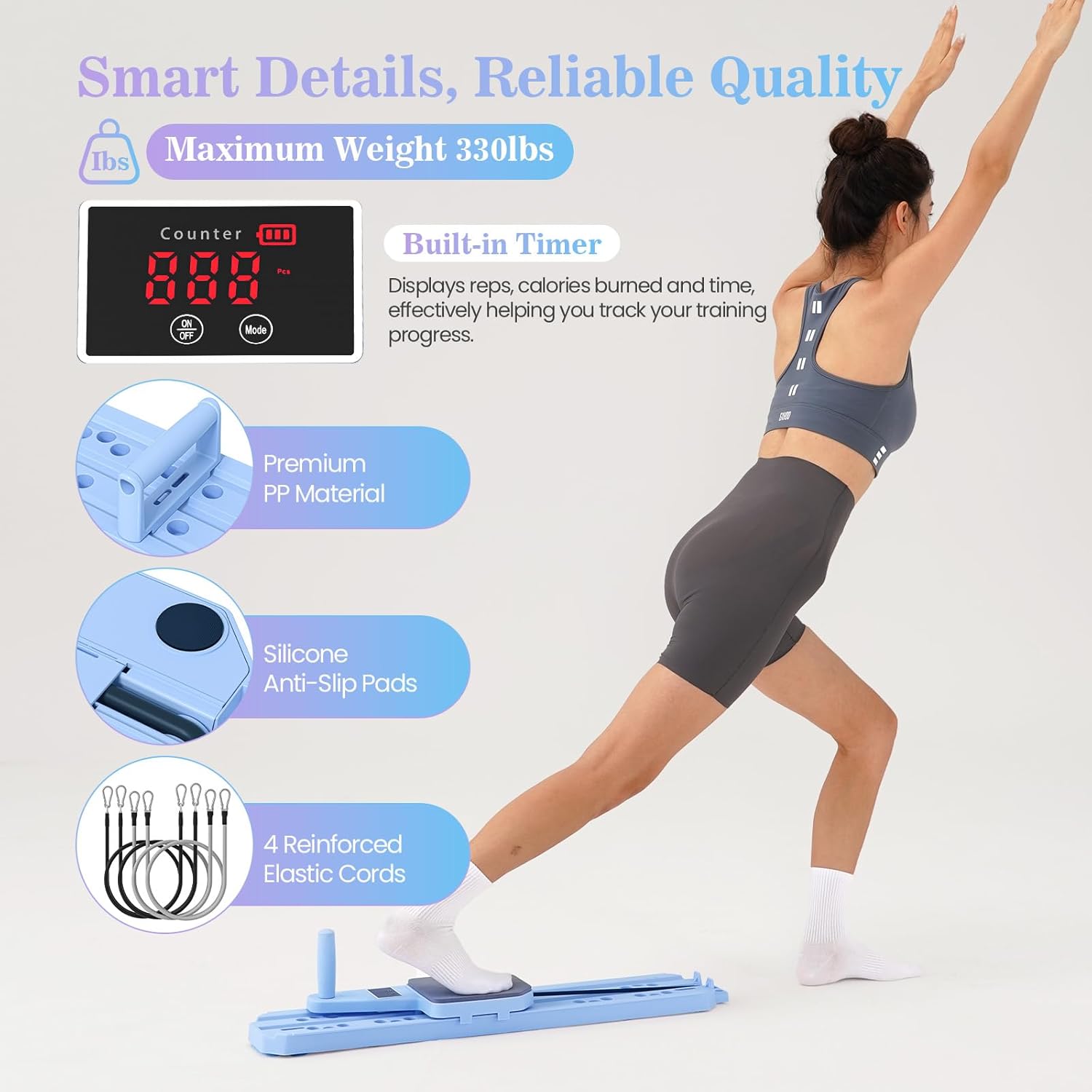 8-in-1 Pilates Euipment – 50+ moves training options, the ultimate Pilates reformer machine alternative! Combining the functions of a Pilates reformer, abs roller, leg machine, ab board, resistance bands, stepper, planks, and even a ski trainer. At-home Pilates reformer perfect for fitness beginners or Pilates enthusiasts, focusing on core stability, pelvic floor, legs, and arms – no gym needed!