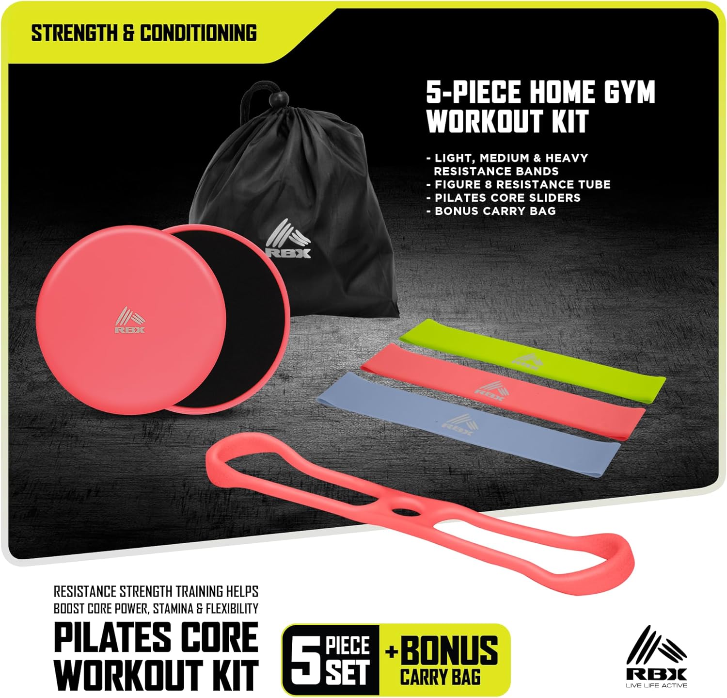 RBX 5 Piece Home Gym Workout Kit – Light, Medium, Heavy Resistance Bands, Figure 8 Resistance Tube, Pilates Core Sliders & Carry Bag
