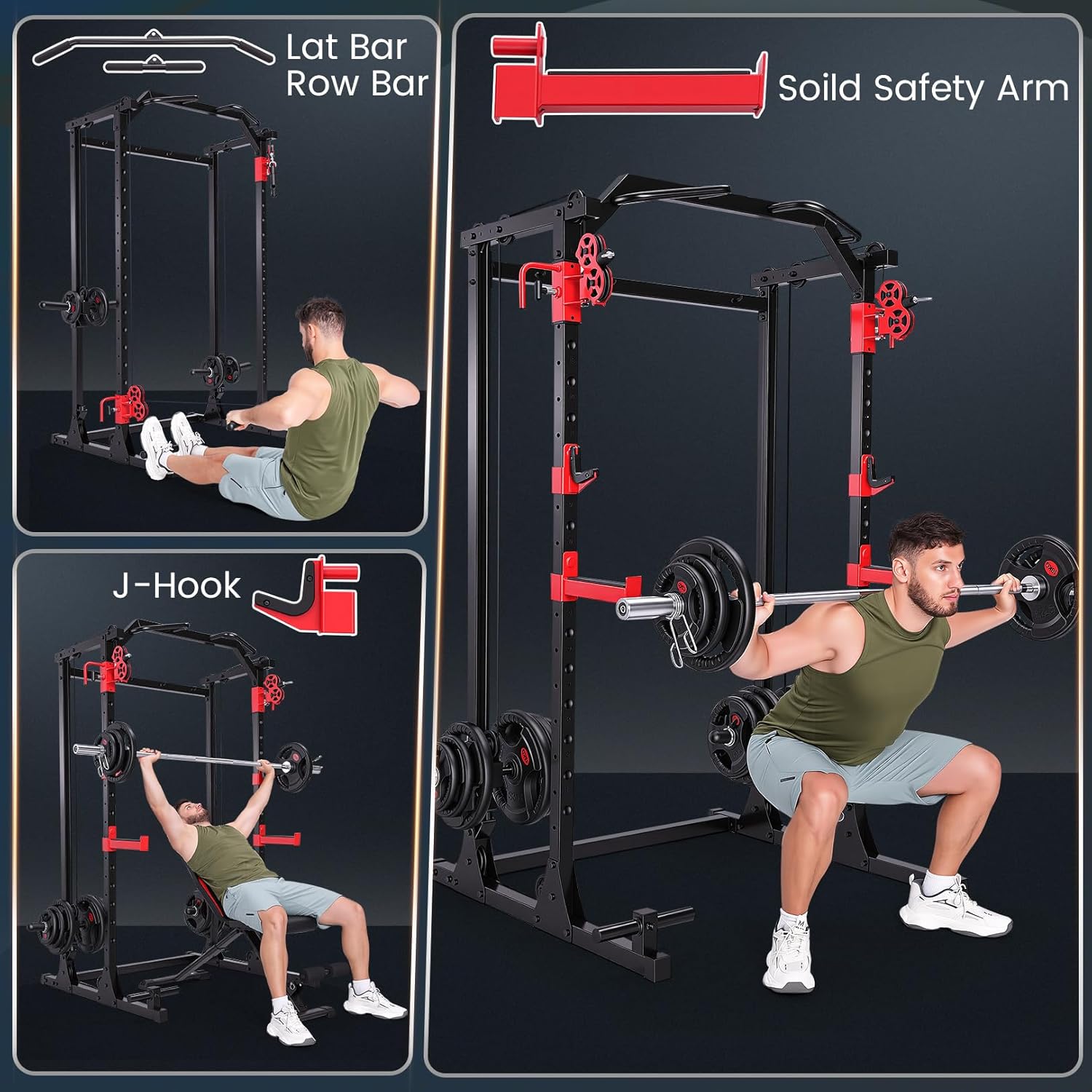 【ULTIMATE 4-IN-1 HOME GYM SOLUTION】Combines power rack, multi-grip pull-up bar, cable crossover machine, and seated rowing machine in one compact unit. The upgraded pulley mechanism with reinforced sliding sleeves ensures seamless operation and extended durability. Maximum 2000 LBS capacity, engineered as premium gym equipment for serious strength training and versatile workout routines