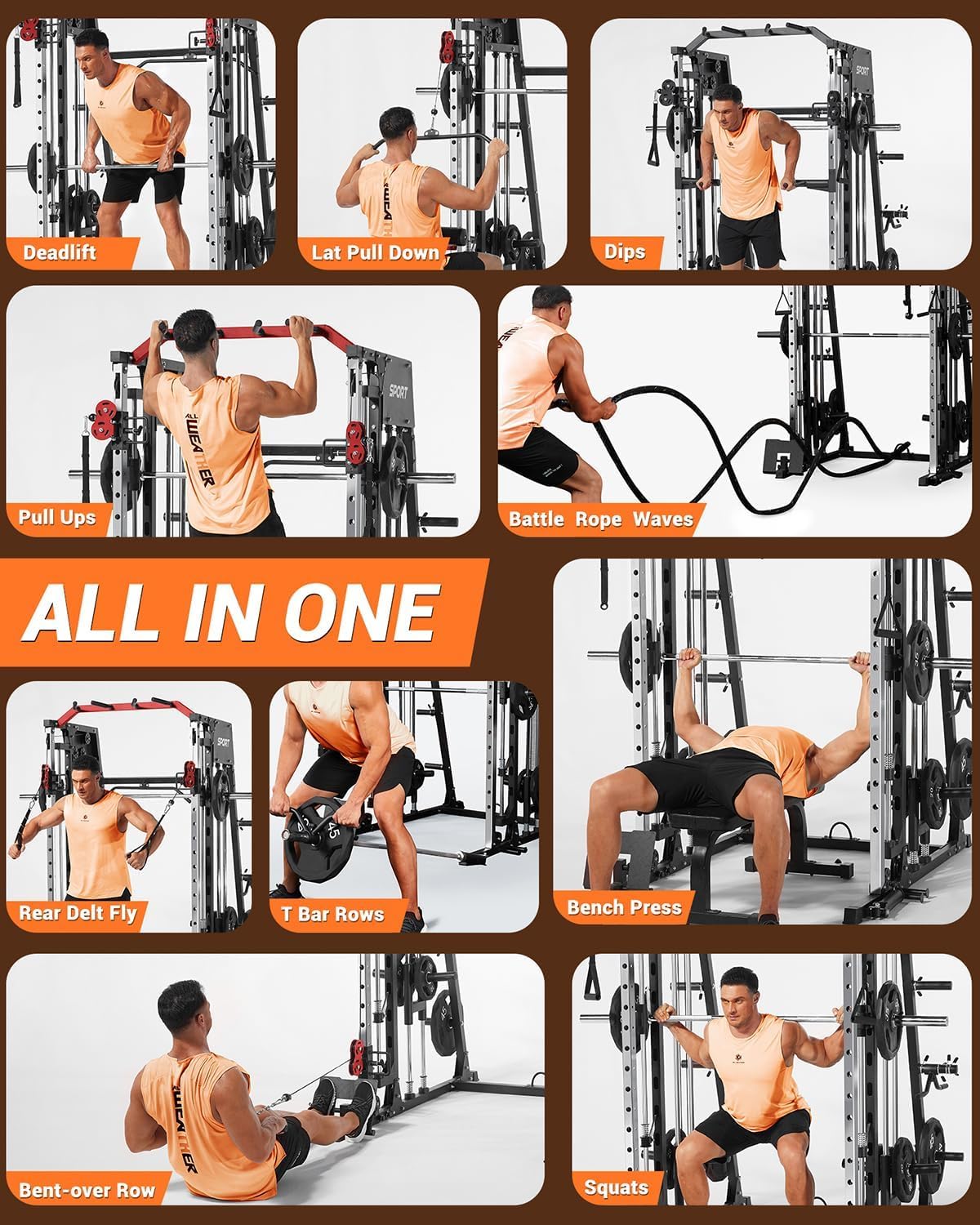 【8-STATIONS IN 1: YOUR ENTIRE GYM SOLUTION】Transform your space into a professional fitness center. This powerhouse integrates a Smith Machine, Power Cage, Cable Crossover, LAT Pull-Down, Pull-Up Station, Leg Developer, Landmine, and a Weight Bench. Eliminate the need for multiple machines and perform hundreds of exercises for a complete full-body workout.