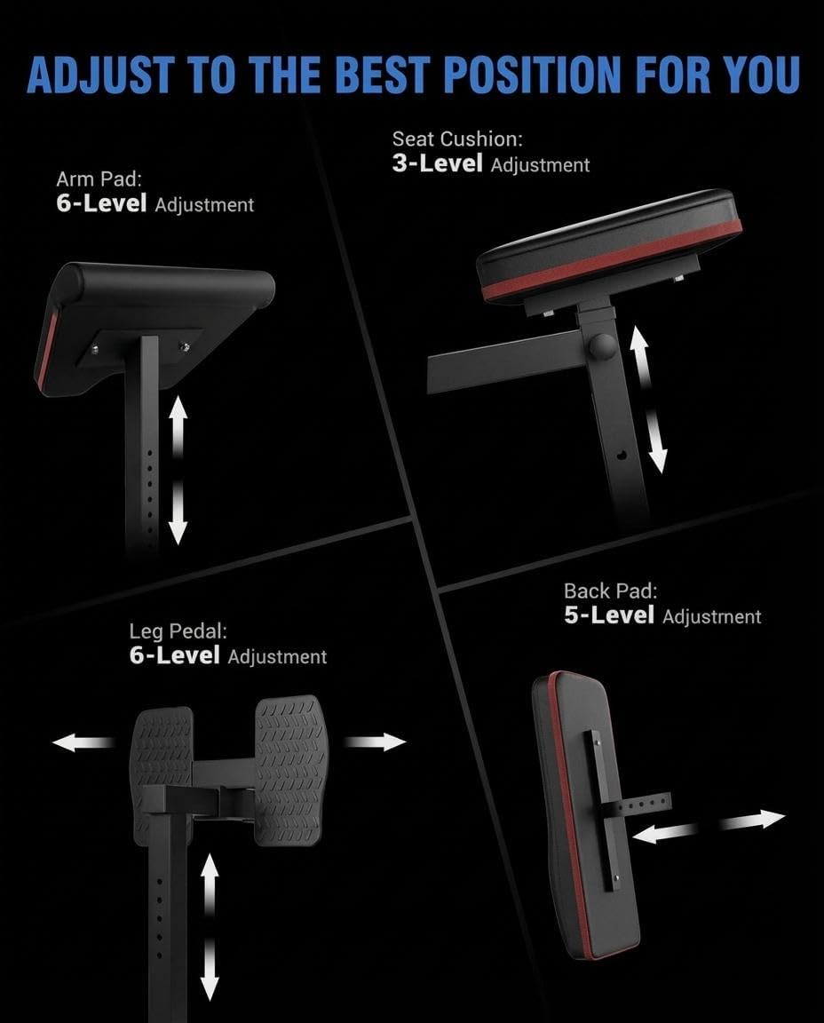 Train longer and stronger with ergonomic engineering that adapts to you. The multi-position seat, adjustable backrest, and customizable arm pads provide optimal support for users of all sizes. Combined with the plush, sweat-resistant padding and anti-slip handles, you can maintain perfect form while focusing on your gains.