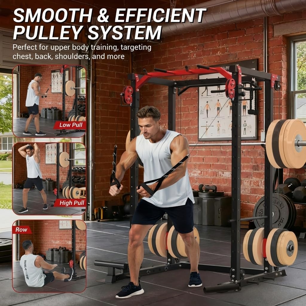【4-in-1 Multifunctional Power Station】The power cage combines a power rack, cable crossover machine, multi-grip pull-up bar, and 360° landmine attachment into one powerful unit. The upgraded pulley track and precision sliding sleeves ensure smooth, stable movement and long-term durability. Weighing 205 lbs with a 1500-lb max capacity, this rack delivers professional-grade stability for your toughest workouts.
