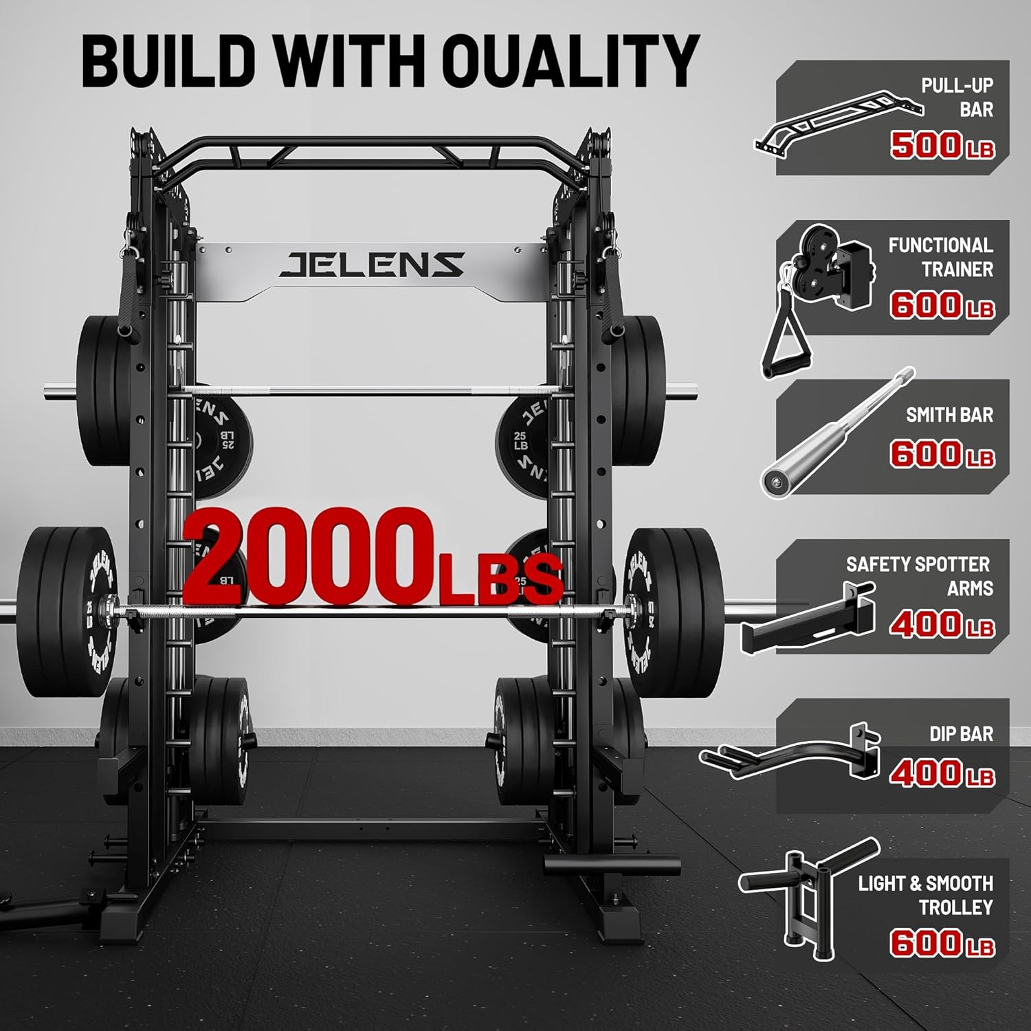 JELENS Smith Machine for Home Gym, Multi-Function M12 Power Cage with Cable Crossover System, Squat Rack with Smith Bar and More Attachment