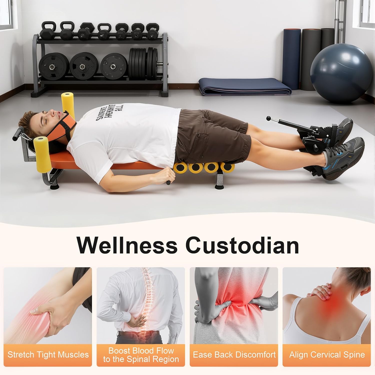 【Therapeutic Comfort Design】High-density EPE foam shoulder pads and tear-resistant PU surface prevent skin irritation during 20-minute sessions. Curved base cradles hips while sponge rollers massage tense muscles. Unlike rigid spinal decompression machines, the angled bench gradually releases pressure without sudden jerks.
