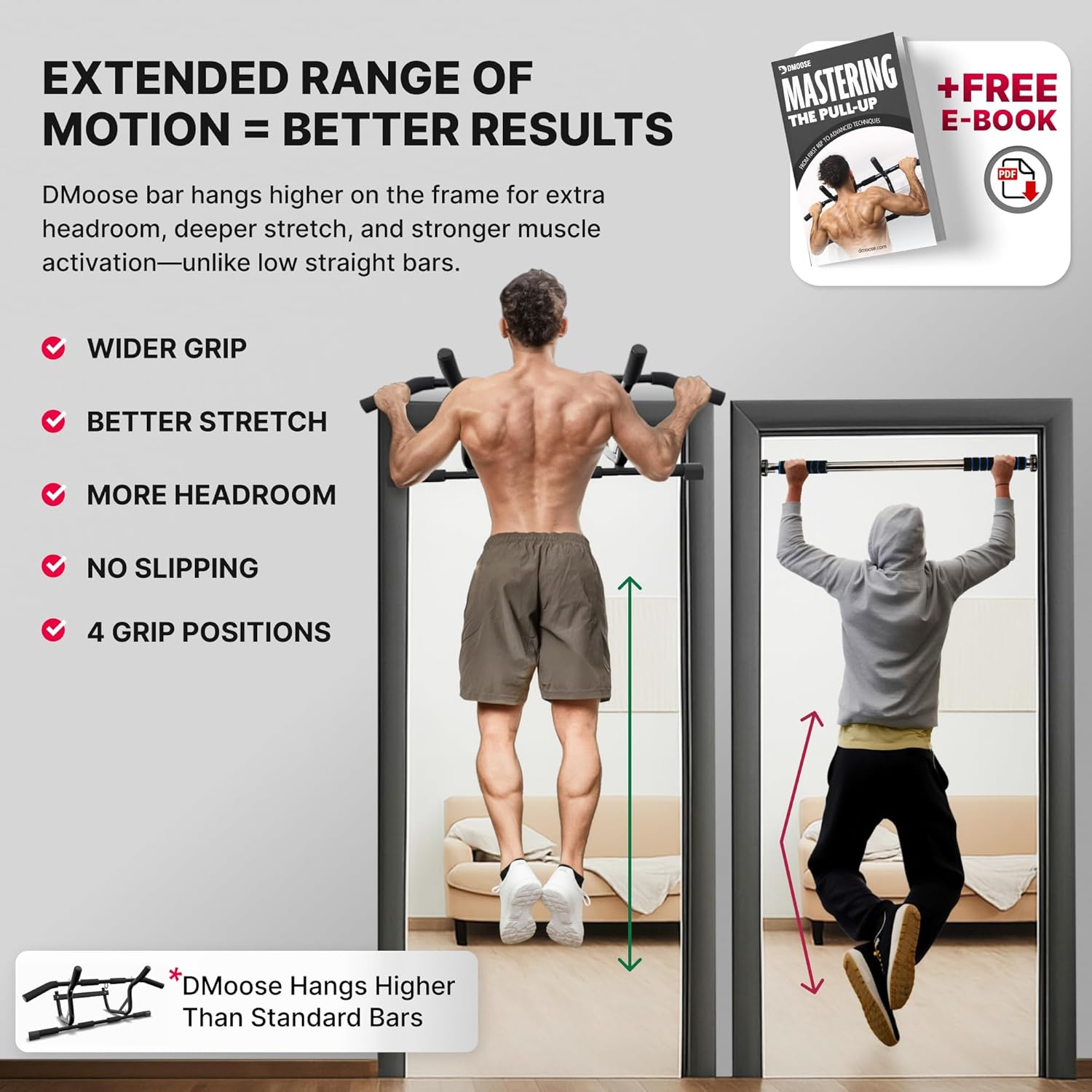 MULTIPLE GRIP OPTIONS: The DMoose Door Pull Up Bar with Pull Up Band offers a wider grip & better stretch with higher placement for more headroom. Its extended range of motion targets muscles effectively while doing push up, pullups for maximizing results from home workouts.