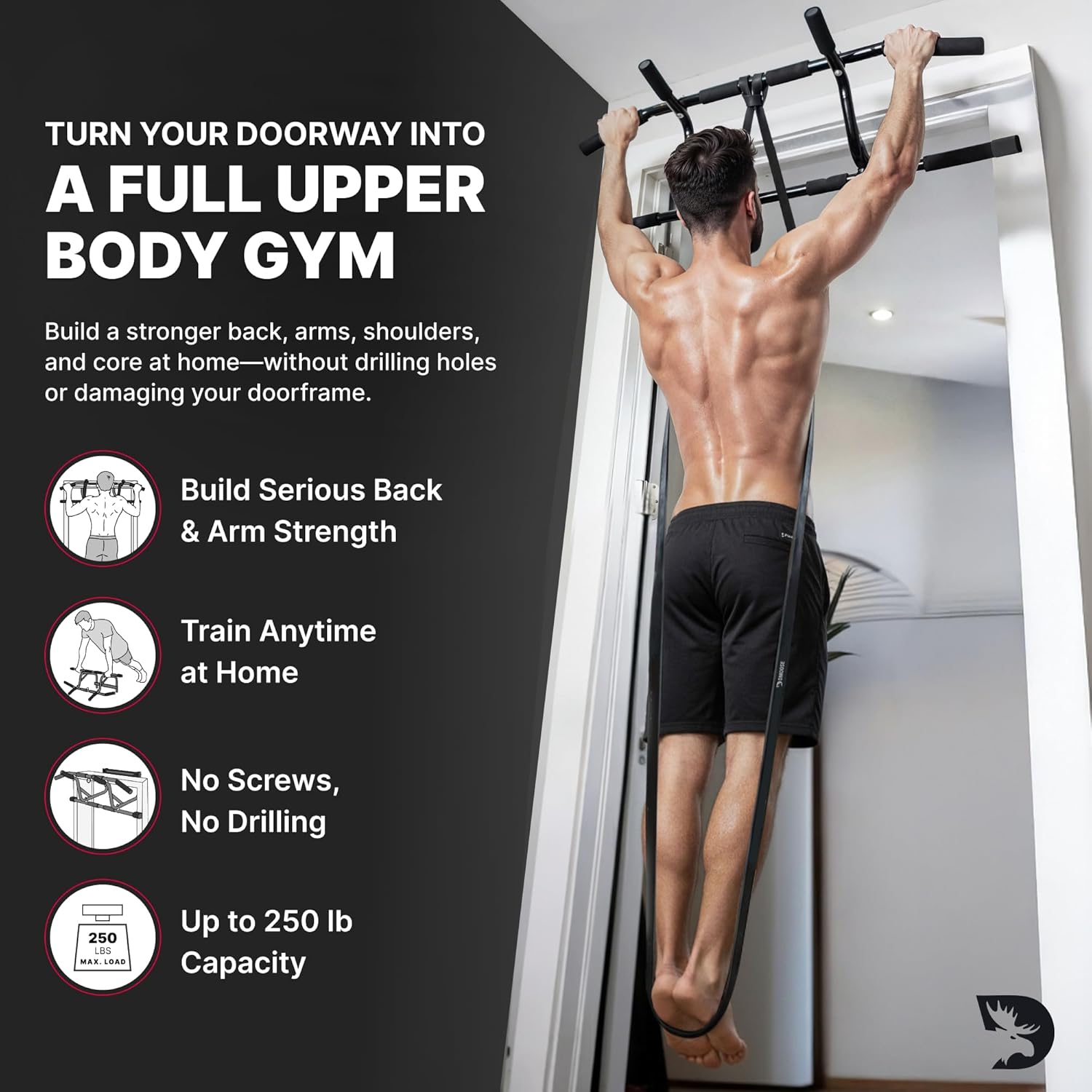 DMoose Fitness Pull Up Bar for Doorway – Upto 250 Lbs Capacity, No Screwing or Slipping, Hanging Pullup & Chin Up Bar for Door Frame – Multi Padded Grips for Strength Training with Installation Guide