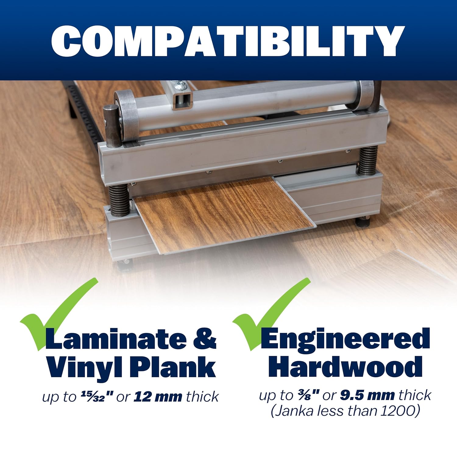 Cuts laminate and vinyl up to 15/32 Inch (12 mm) thick and engineered wood up to 3/8 Inch (9.5 mm) thick, up to a Janka of 1200