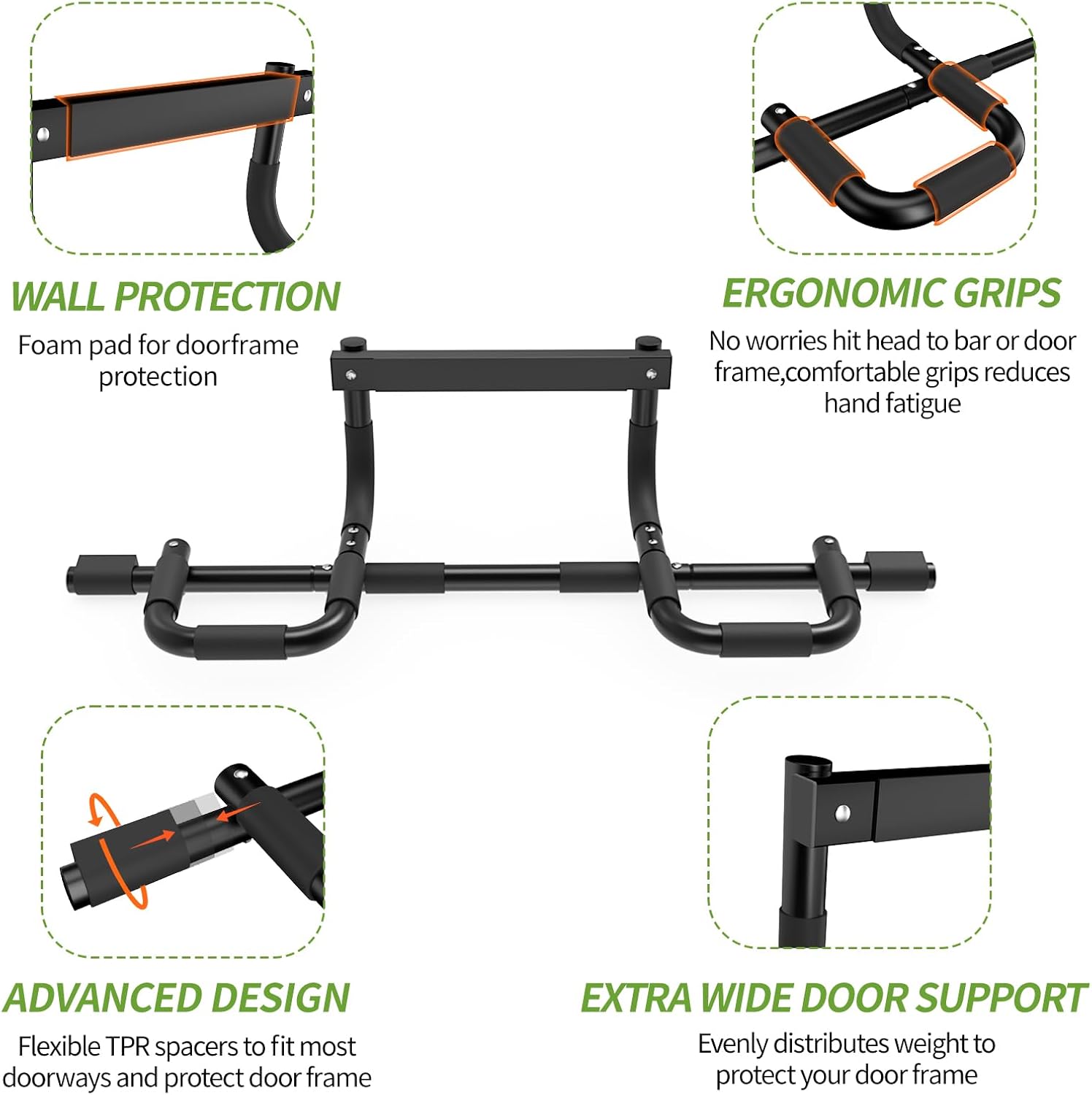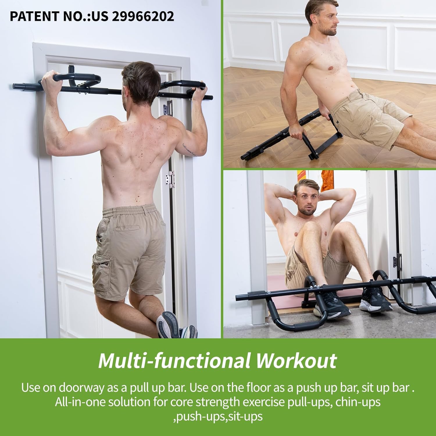 Efficient Core Workout: The pull up bar has multi grip positions making it the perfect piece of upper body exercise equipment. Use on doorway as a pull up bar. Use on the floor as a push up bar, sit up bar .All-in-one solution for core strength exercise pull-ups, chin-ups ,push-ups,sit-ups.