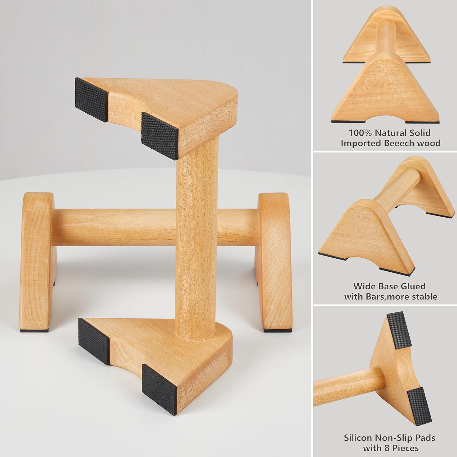 Quality Beech Wood Parallettes Bars: This triangle wood push- up bars made of imported solid beech wood, not plastic or cheap wood sets, strong and durable and the wood material touch not too cold or stiff.