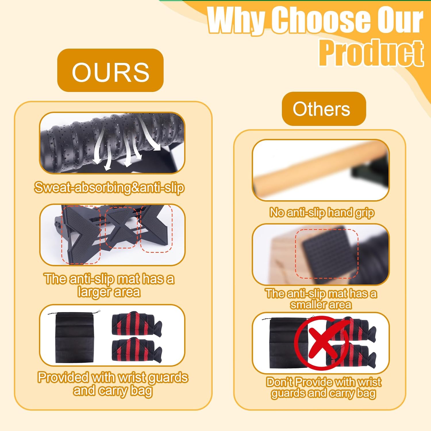 【VERSATILE CALISTHENICS EQUIPMENT】With our push-up bars, you can complete countless push-ups, L-shaped push-ups, planks, gymnastics, handstand push-ups, deep push-ups,which can can provide comprehensive exercise for the upper body.Thanks to the increased downward movement, they extend your movement amplitude and offer an additional training effect